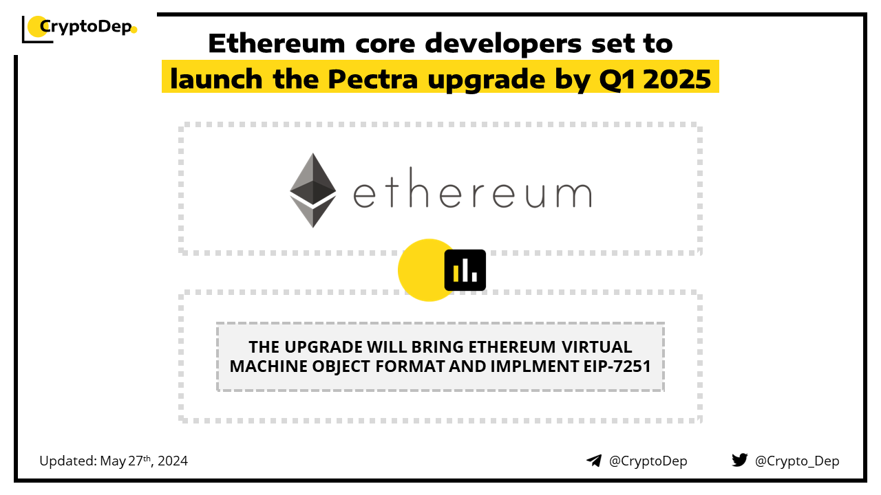 Ethereum core developers aim to release the Pectra upgrade by the first quarter of 2025. The innovation will implement the Ethereum Virtual Machine Object Format (EOF), comprising about 11 improvement proposals that enhance the EVM code on both L1s and L2s. Moreover, the update will bring EIP-7251, known as βincrease max effective balance,β allowing validators to stake up to 2,048 ETH, instead of the current maximum limit of 32 ETH.