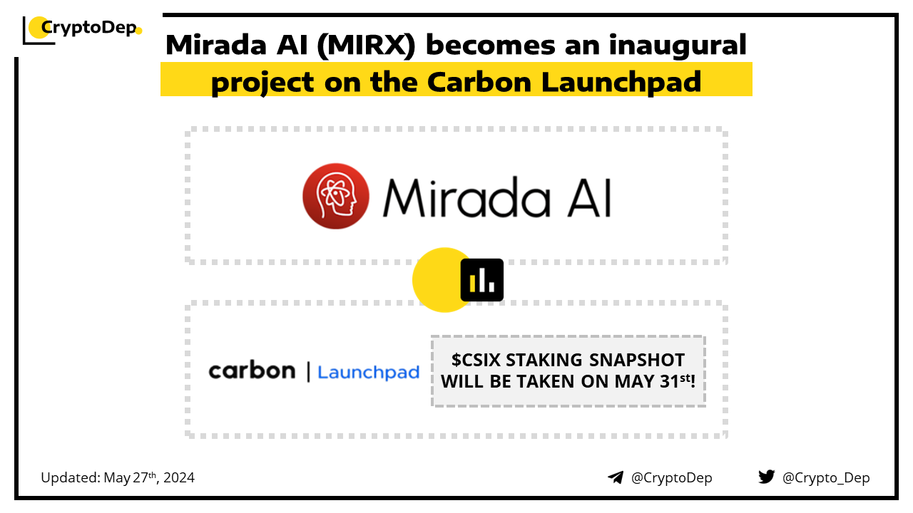 Mirada AI will be launched on the Carbon Launchpad with a $CSIX staking snapshot to be taken on May 31st. Users will need to stake at least 1,000 $CSIX to participate in the token sale. Mirada AI has also recently undergone a rebranding. Mirada AI is a decentralized AI tool, powered by AI via $MIRX, that offers image generation, face-swap, animation, LLM chat, image upscaling, and more.