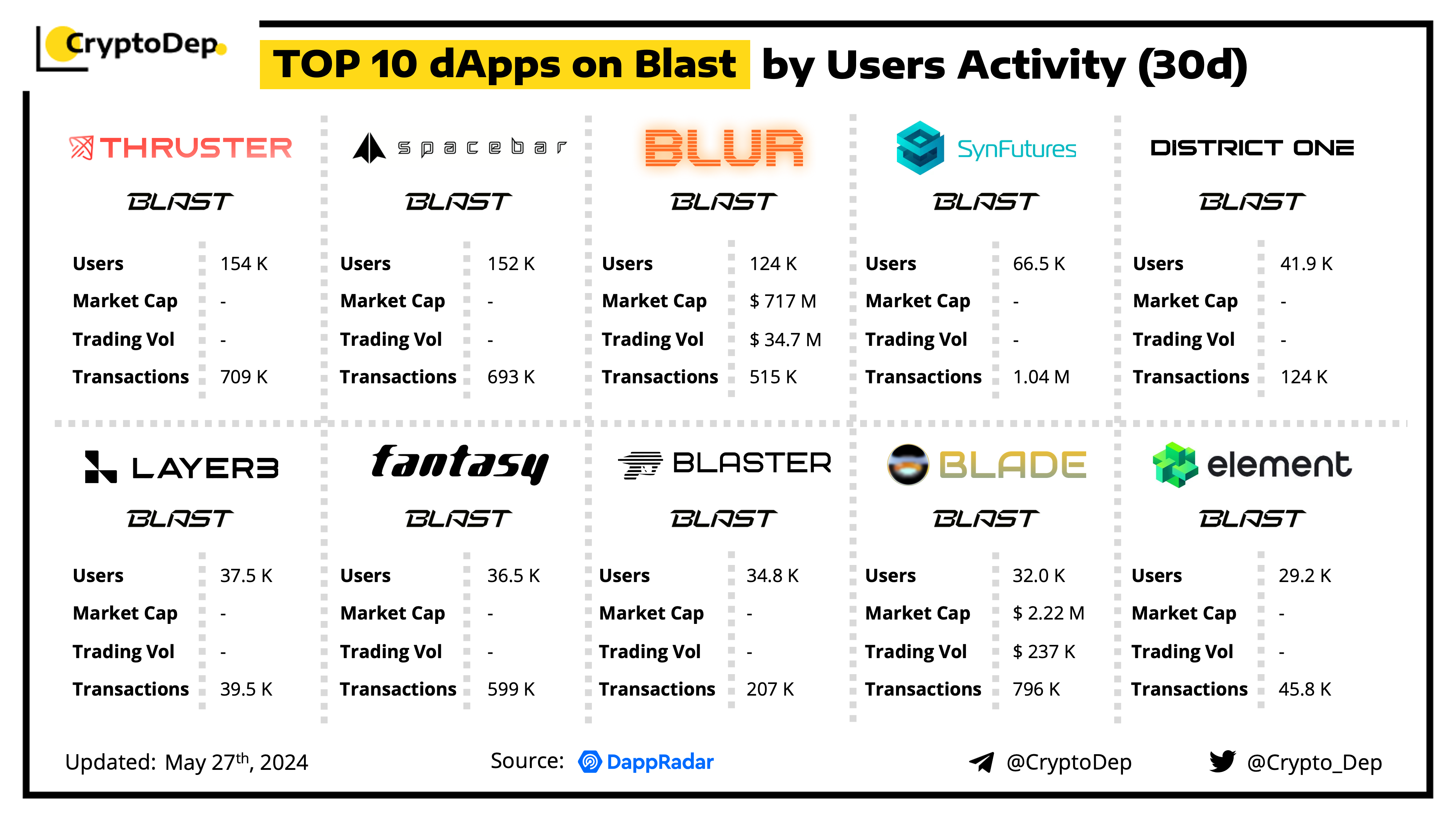 A decentralized application (dApp) is a program built on blockchain that combines a smart contract and a front-end user interface. We present the top dApps on #Blast by users activity in the last 30 days, according to the data from DappRadar.