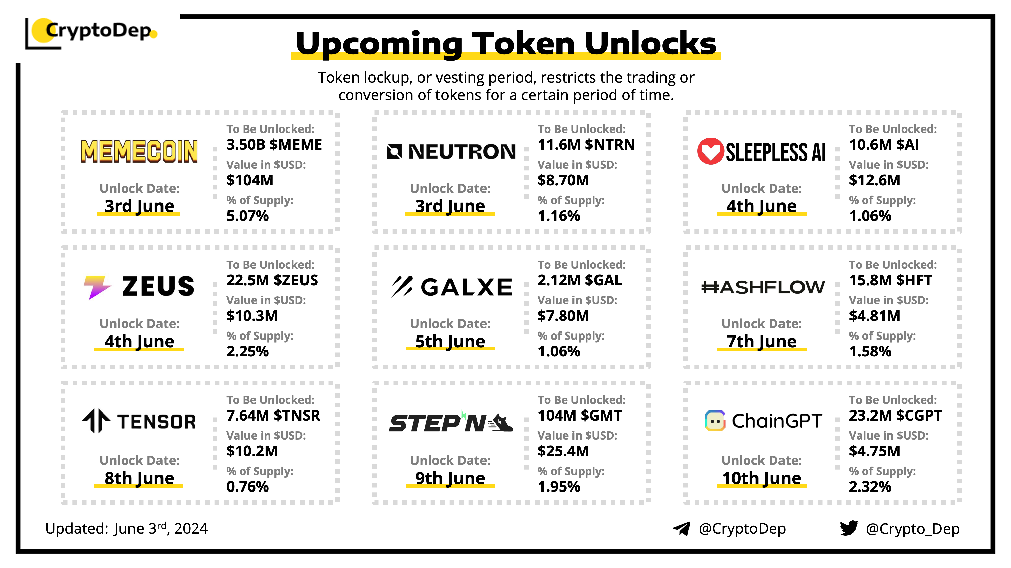 Let's take a look at the compilation of major upcoming token unlocks, diving into details such as dates, amounts, and projects related to tokens that are currently locked up, but will soon be released to the market. During this week, $MEME, $GMT, $AI, $ZEUS, and $TNSR will have the biggest unlocks.