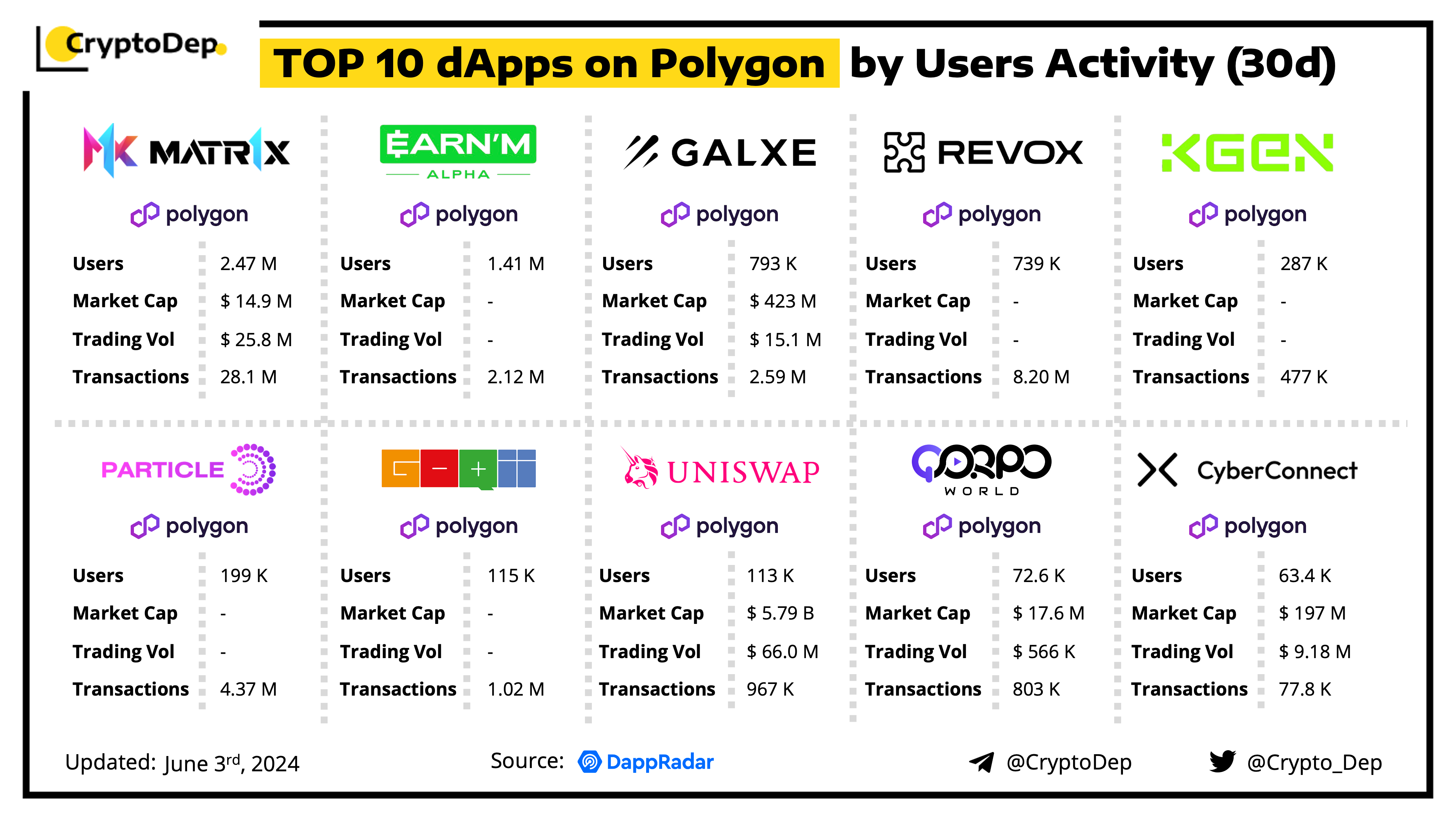 A decentralized application (dApp) is a program built on blockchain that combines a smart contract and a front-end user interface. We present the top dApps on #Polygon by volume in the last 30 days, according to the data from DappRadar.