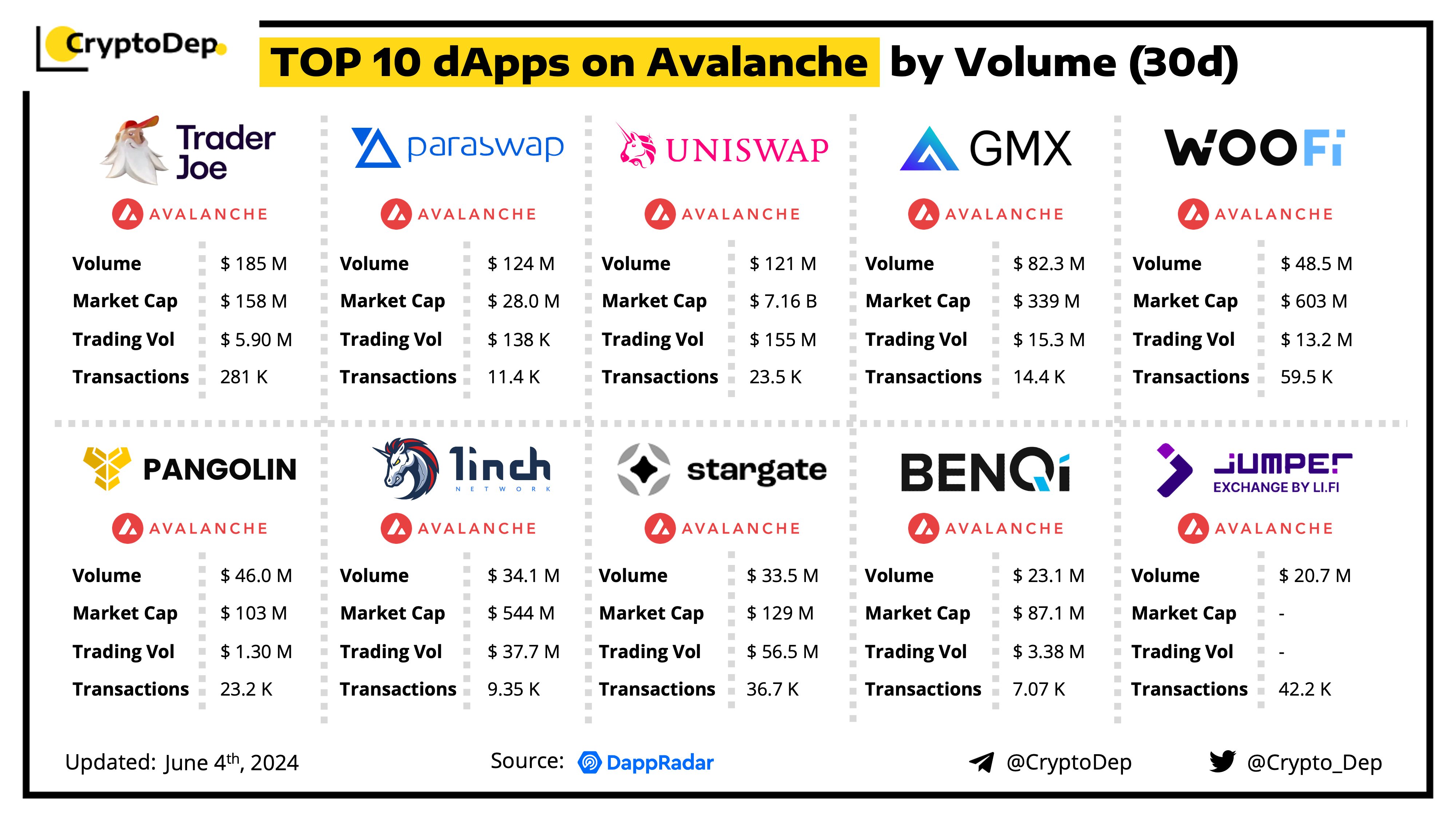 A decentralized application (dApp) is a program built on blockchain that combines a smart contract and a front-end user interface. We present the top dApps on #Avalanche by volume in the last 30 days, according to the data from DappRadar.