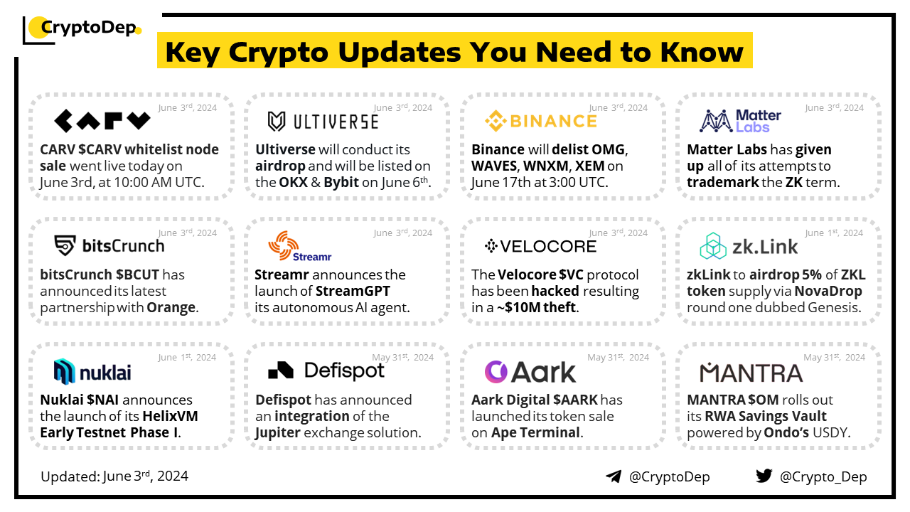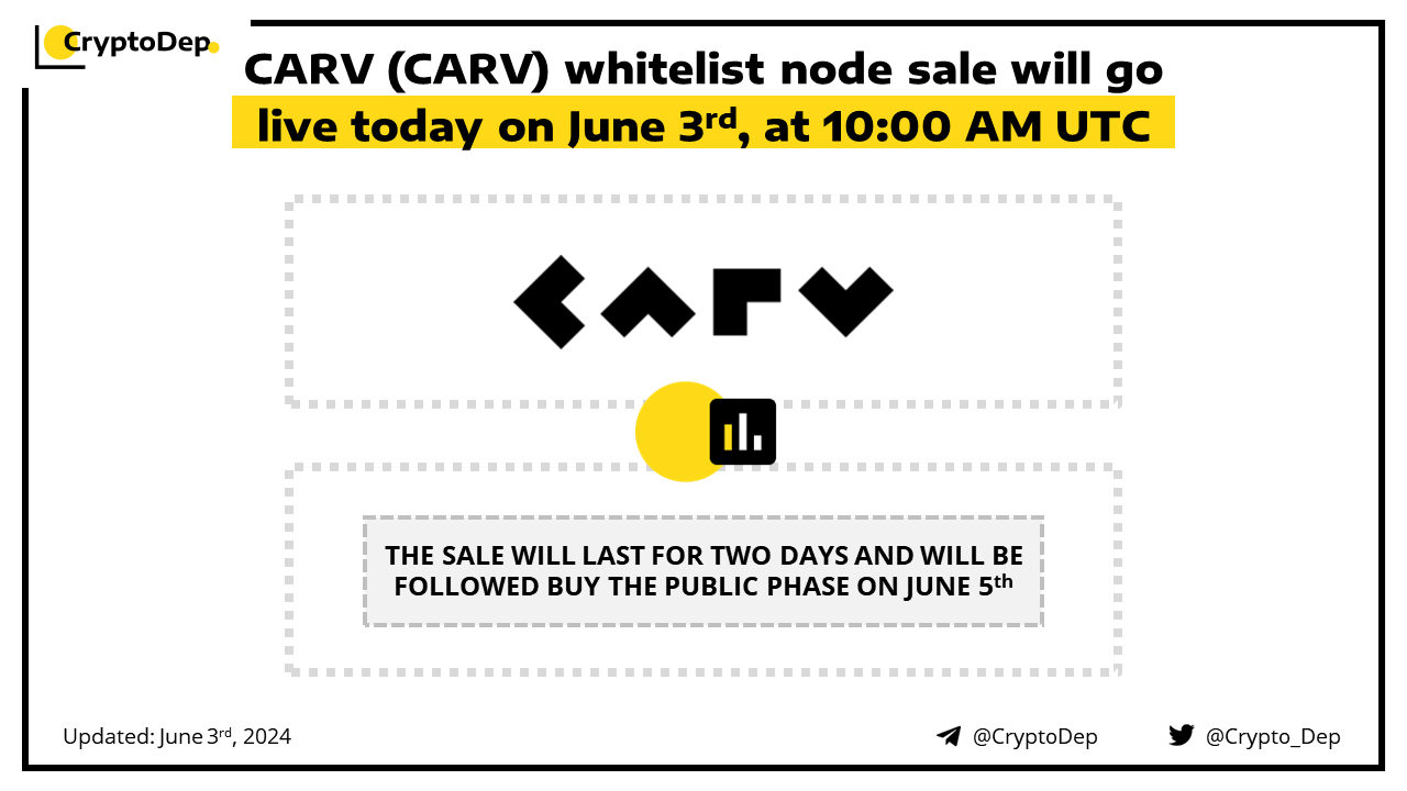 CARV will kick off its whitelist node sale today, on June 3rd, at 10:00 AM UTC. The sale will last for two days and will be followed by the public sale phase on June 5th, at 10:00 AM UTC. Eligible users will be able to purchase the node today and get a 10% discount via our promo code - cryptodep. CARV has previously raised $10M in its Series A funding from OKX Ventures, IOSG Ventures, Fenbushi Capital, Hashkey, and others. CARV Protocol is a modular data layer for gaming and AI.
