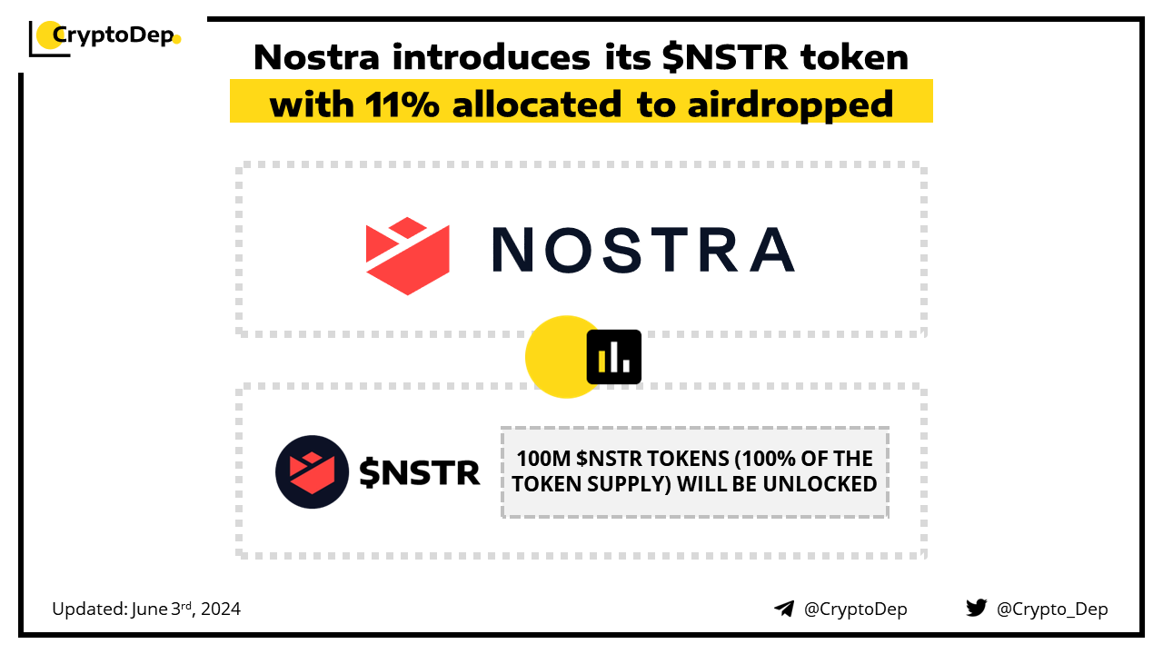 Nostra has unveiled the tokenomics of its $NSTR token that will be launched on June 17th. All 100M $NSTR (100% of the NSTR supply) will be unlocked on TGE with 11% airdropped to the community on TGE. Nostra holds over 70% of the total value locked on Starknet with more than $270M secured by Nostra. Nostra is a liquidity protocol built on Starknet, that allows users to lend, borrow, bridge, stake, and trade crypto on-chain.