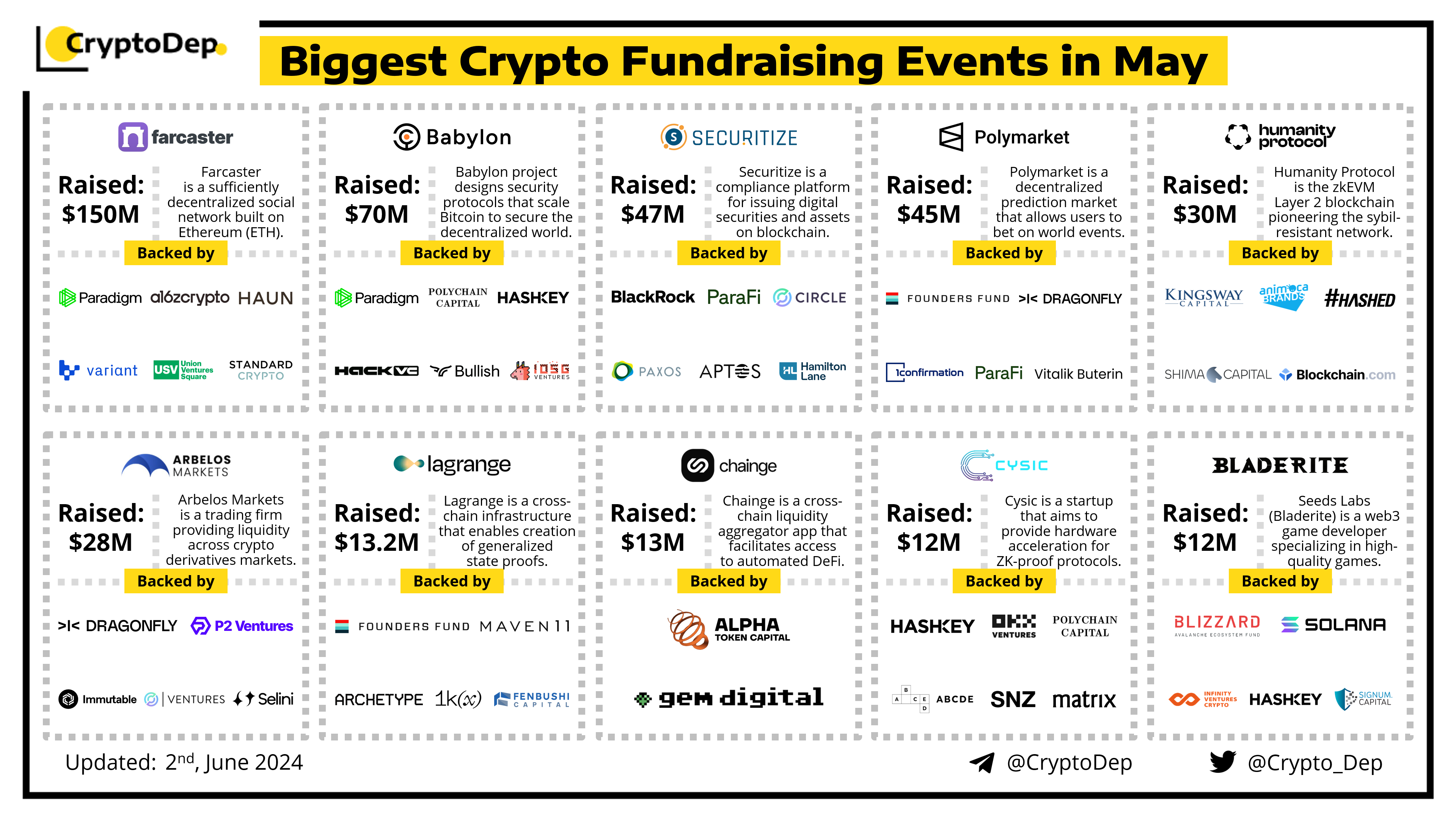 Presenting a list of the biggest crypto fundraising rounds in May 2024, backed by well-known investors such as BlackRock, Paradigm, a16z crypto, Dragonfly, P2 Ventures, Polychain, Hack VC, Circle Ventures, Animoca Brands, Hashed, OKX Ventures, Hashkey, Haun Ventures, Fenbushi, Aptos, Immutable, and others. Let's take a look!