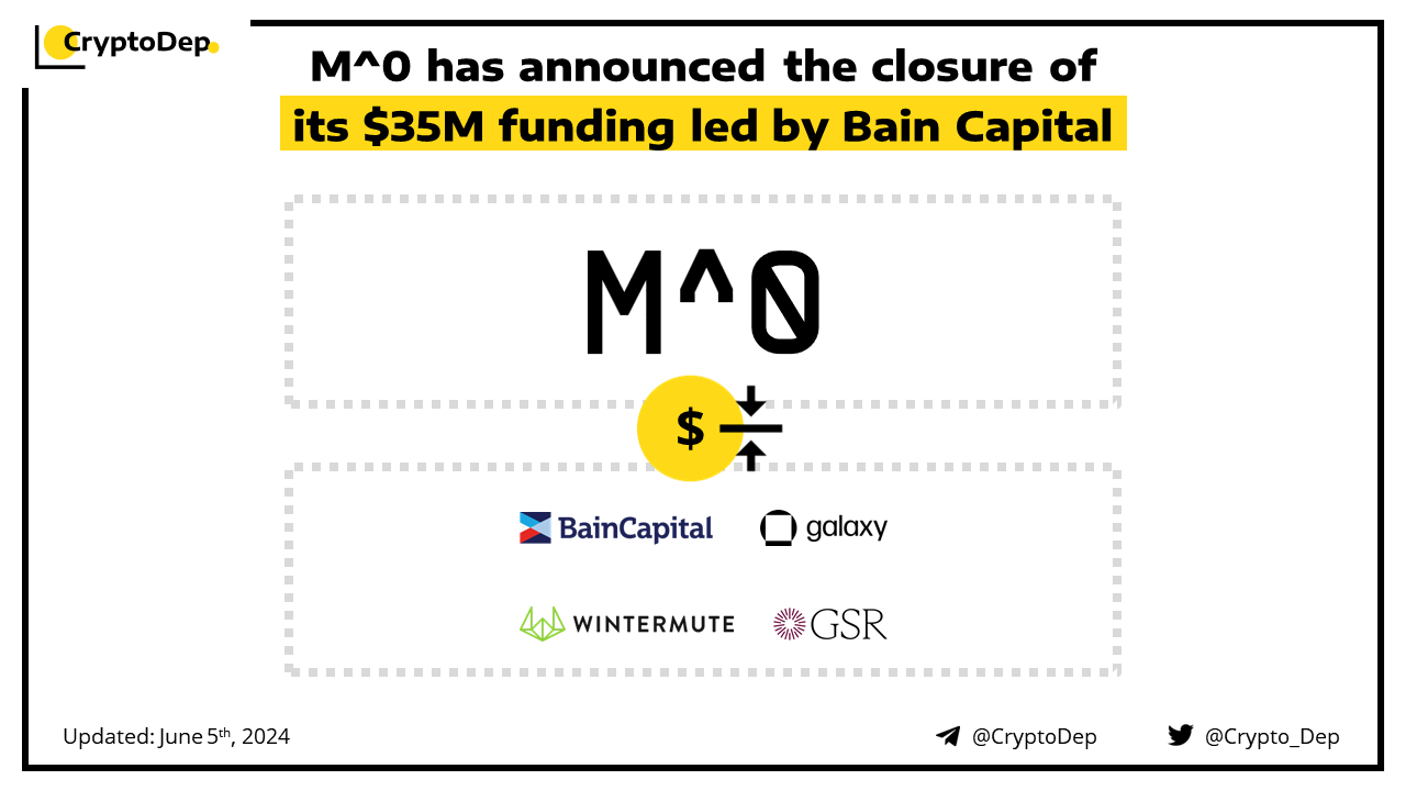 M^0, a decentralized stablecoin minting protocol, raises $35M in Series A funding led by Bain Capital. The round also featured participation from Galaxy Ventures, Wintermute Ventures, and GSR. Earlier in 2023, M^0 raised $22.5M from Pantera Capital, Standard Crypto, The SALT Fund, ParaFi Capital, and others. M^0 develops a decentralized infrastructure that allows any institution to mint stablecoins backed by U.S. Treasuries.