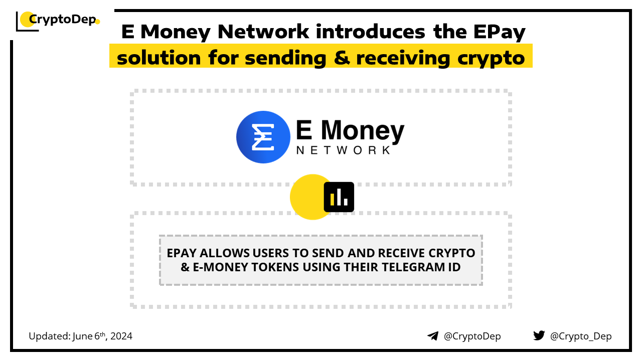 E Money Network rolls out the EPay platform for crypto, fiat, and e-money transactions. This innovation allows users to send and receive crypto & e-money tokens using their Telegram ID. The project has also partnered with Chorus One to allow its users to stake their digital assets and earn various returns. E Money Network, recently rebranded from Scallop, is a pioneering modular RWA Chain with compliance blocks.