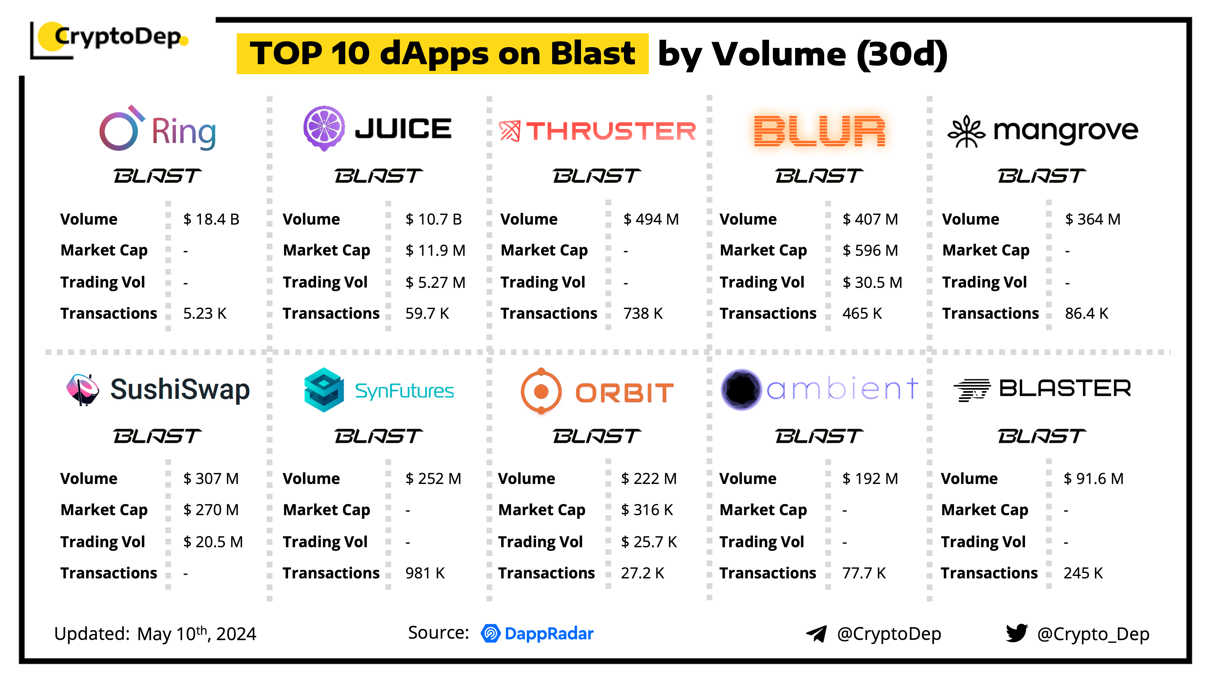 A decentralized application (dApp) is a program built on blockchain that combines a smart contract and a front-end user interface. We present the top dApps on #Blast by volume in the last 30 days, according to the data from DappRadar.