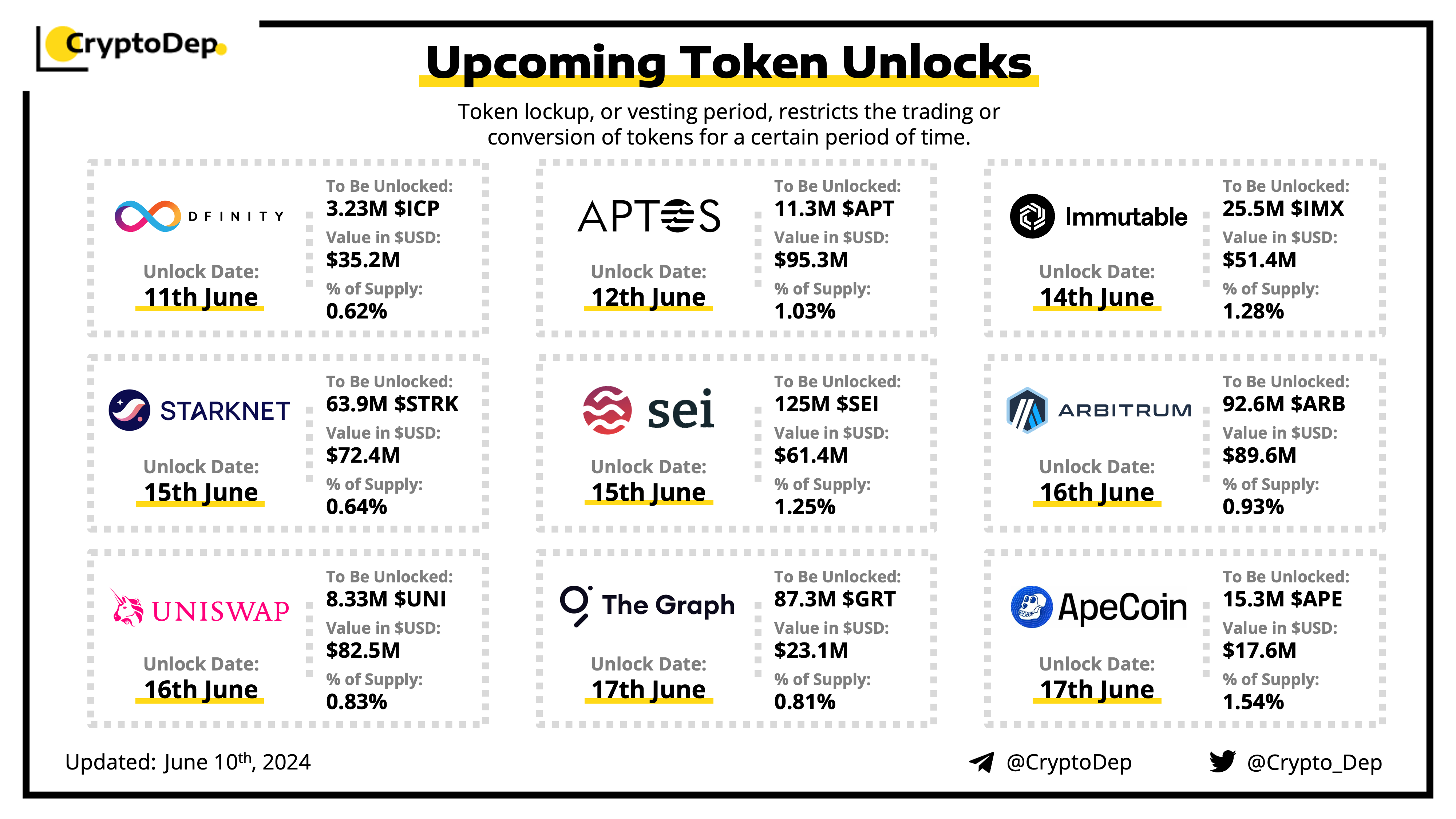 Let's take a look at the compilation of major upcoming token unlocks, diving into details such as dates, amounts, and projects related to tokens that are currently locked up, but will soon be released to the market. During this week, $APT, $ARB, $UNI, $STRK, and $SEI will have the biggest unlocks.