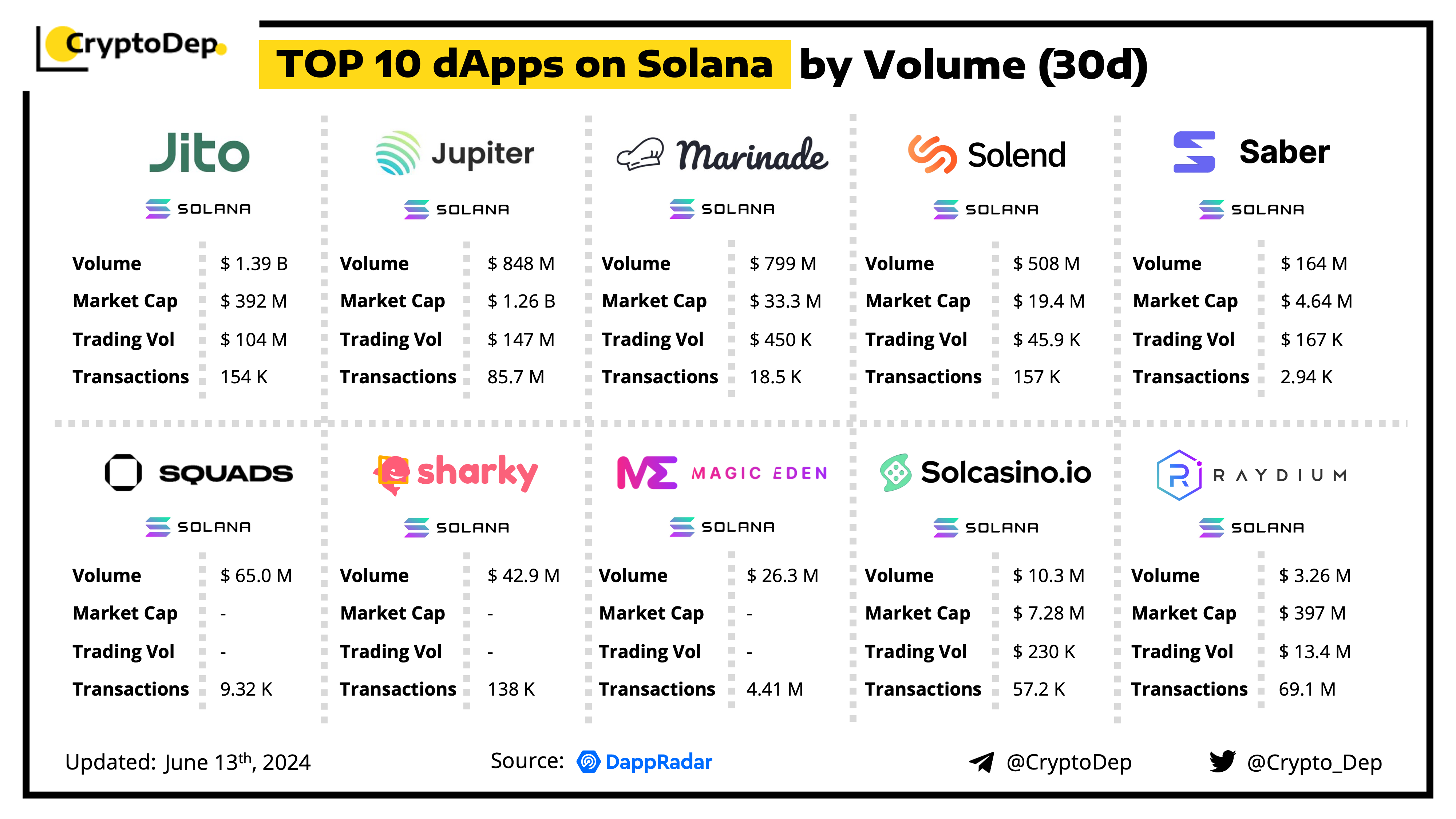 A decentralized application (dApp) is a program built on blockchain that combines a smart contract and a front-end user interface. We present the top dApps on #Solana by volume in the last 30 days, according to the data from DappRadar.