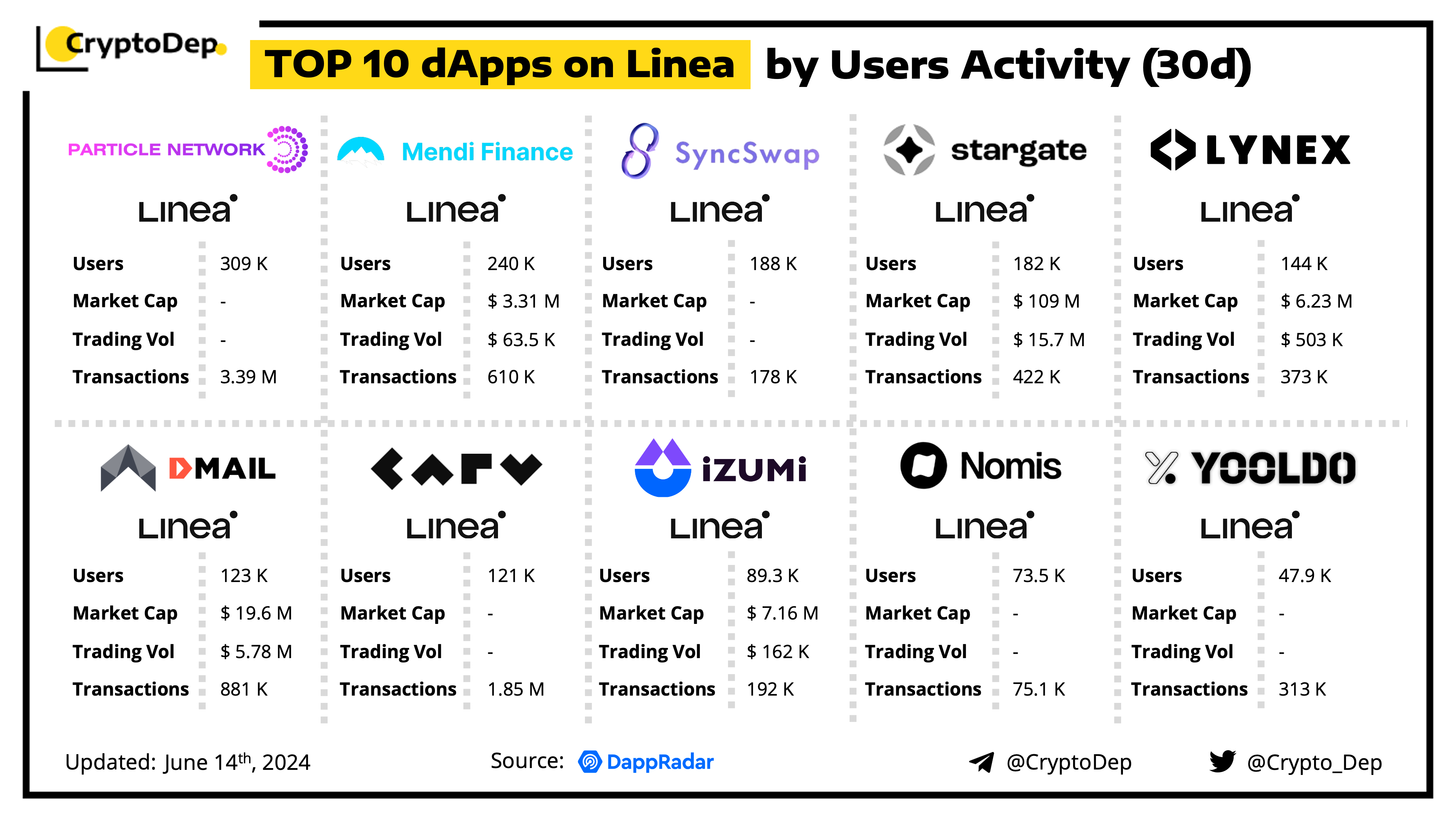 A decentralized application (dApp) is a program built on blockchain that combines a smart contract and a front-end user interface. We present the top dApps on #Linea by users activity in the last 30 days, according to the data from DappRadar.