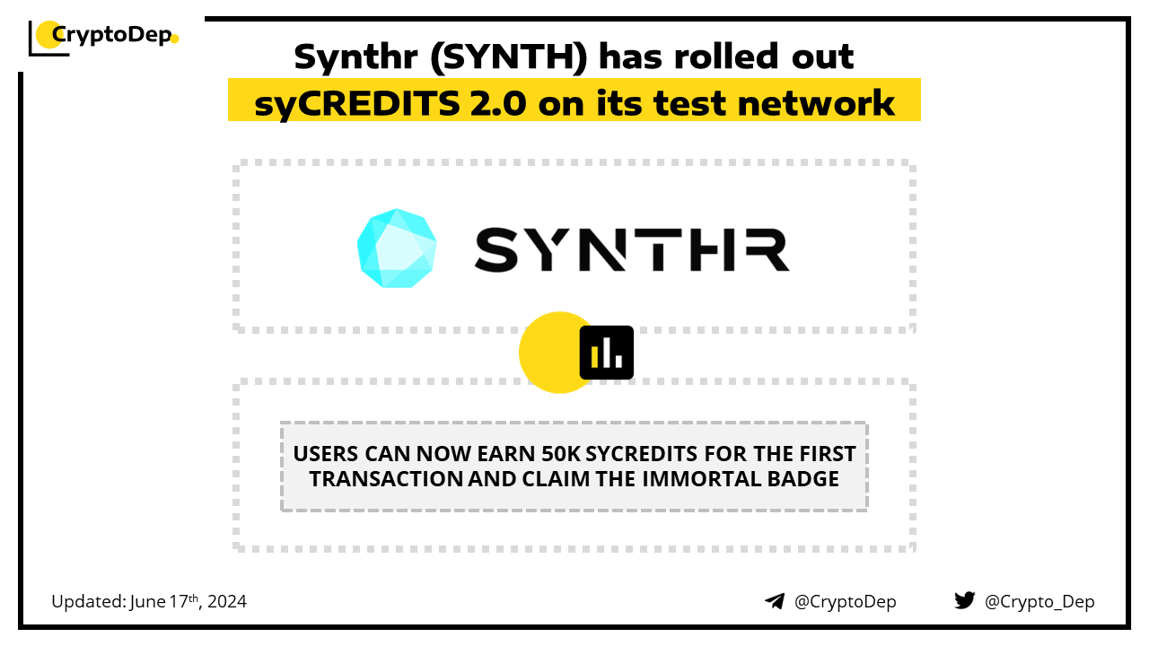 Synthr announces the launch of syCREDITS 2.0 on its testnet, with leaderboard standings directly corresponding to various community benefits. Users can now earn 50K syCREDITS for the first transaction, claim the immortal badge with 10 referrals, and 5X syCREDITS via the Zealy quests. Synthr is an interoperable omnichain liquidity protocol, backed by Outlier Ventures, Oriole Ventures, Morningstar Ventures, and others.