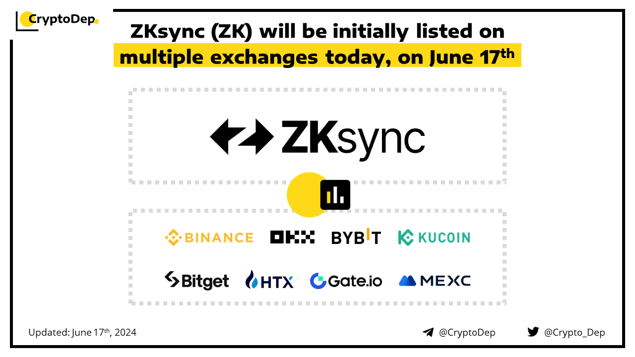 โโZKsync (ZK) will be initially listed on multiple exchanges today, on June 17th