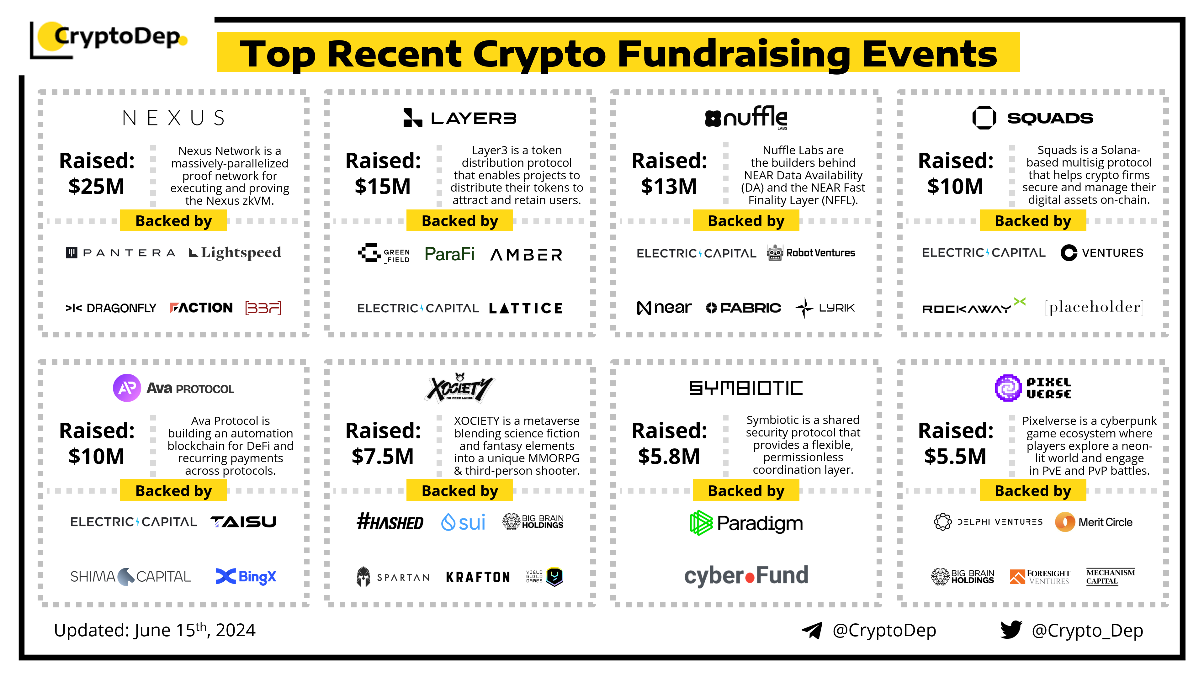 Presenting a list of some recent crypto fundraising events, backed by well-known investors such as Paradigm, Pantera Capital, Dragonfly, Electric Capital, Hashed, Coinbase Ventures, Spartan, Robot Ventures, ParaFi, Mechanism Capital, Shima Capital, Delphi Digital, Merit Circle, Sui, Near, and others. Let's take a look!