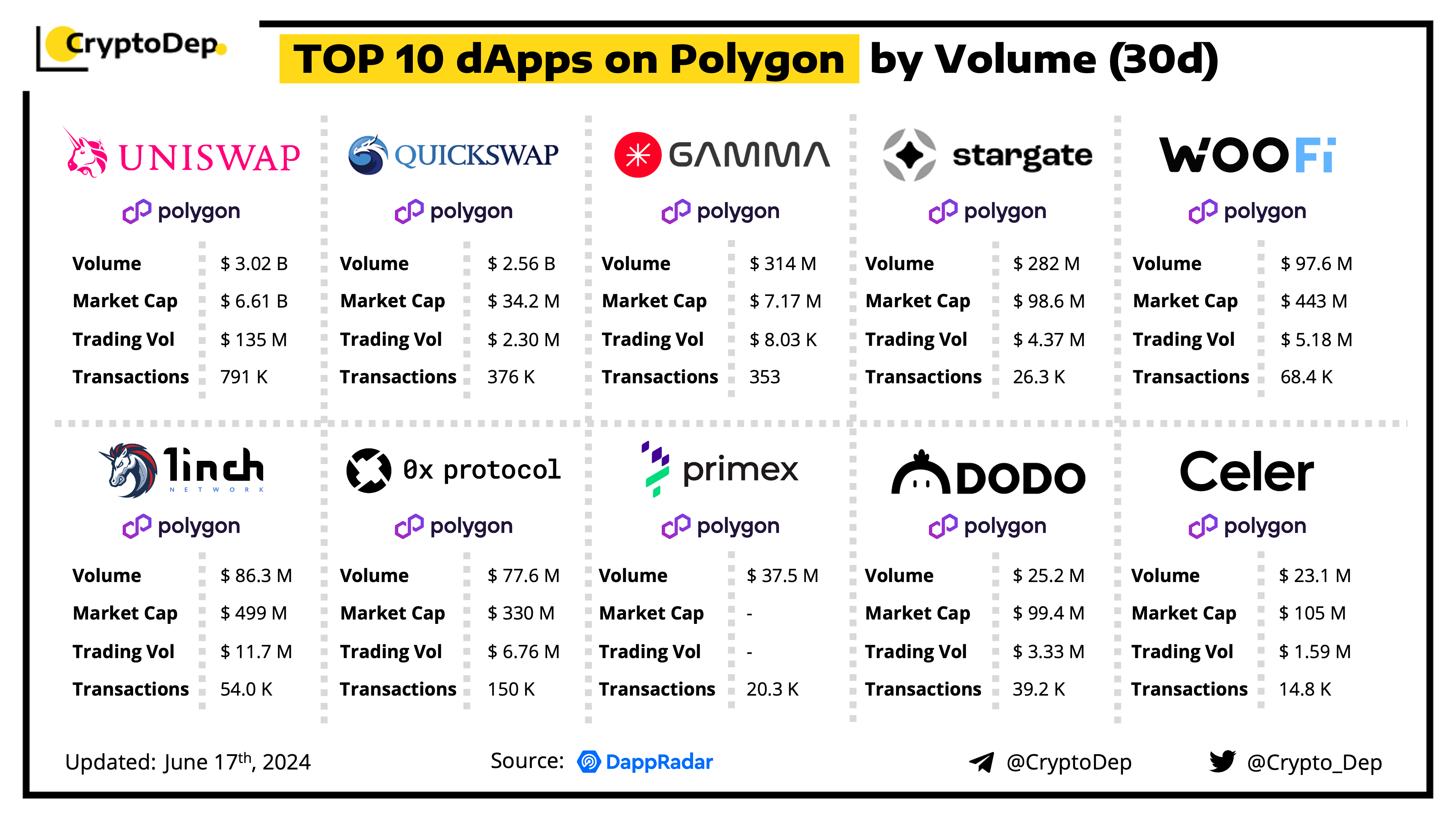 A decentralized application (dApp) is a program built on blockchain that combines a smart contract and a front-end user interface. We present the top dApps on #Polygon by volume in the last 30 days, according to the data from DappRadar.