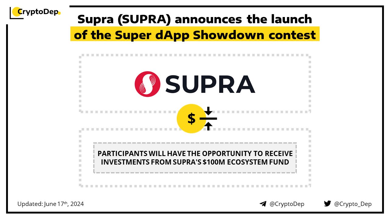 Supra kicks off the Super dApp Showdown competition for blockchain developers to build and deploy on Supra's robust Layer-1 network. Participants will have the opportunity to compete for investments from Supra's $100M Ecosystem Fund. The first season of the competition is scheduled to begin in August 2024, with a panel of judges that includes representatives from Supra, Google Cloud, Republic Crypto, Hashkey Capital, and Killer Whales.