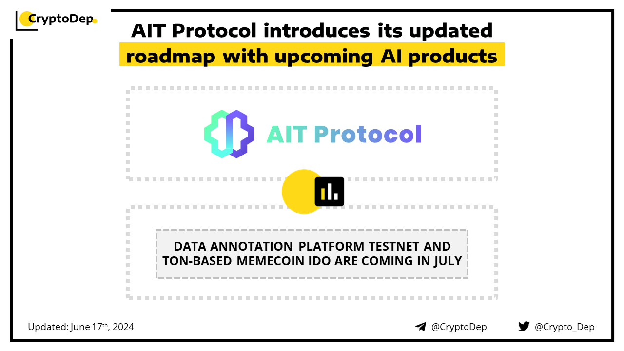 AIT Protocol has unveiled its updated roadmap that features upcoming AI products and their launch timeline. During Q3 - Q4 2024, the project will be focused on platform launch, expansion, initial offerings, and ecosystem building. More specifically, Data Annotation Platform Testnet and TON-based memecoin IDO are coming in July. The phase will be followed by monetization and growth strategies, coming in Q1 2025.