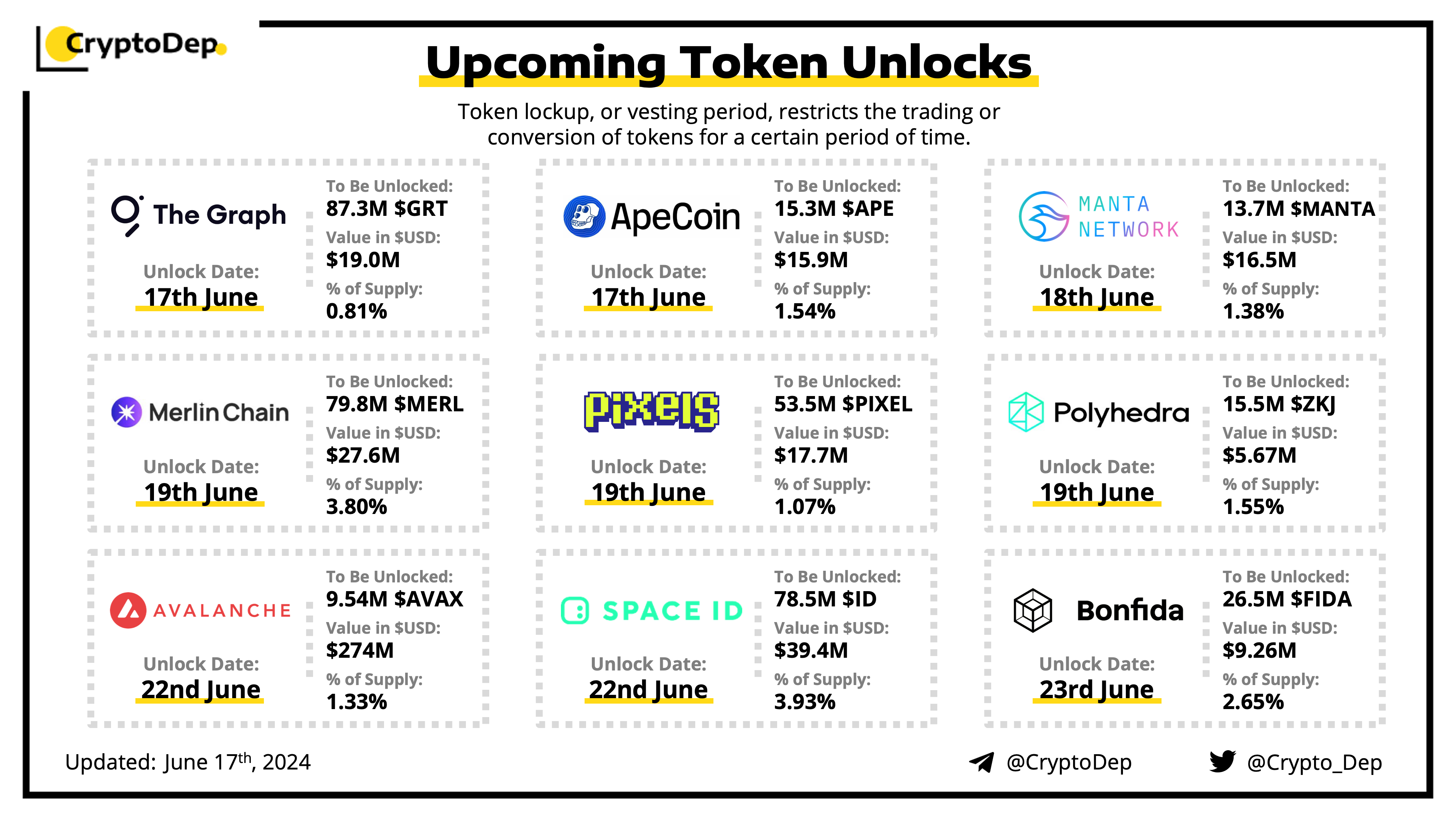 Let's take a look at the compilation of major upcoming token unlocks, diving into details such as dates, amounts, and projects related to tokens that are currently locked up, but will soon be released to the market. During this week, $AVAX, $ID, $MERL, $GRT, and $PIXEL will have the biggest unlocks.