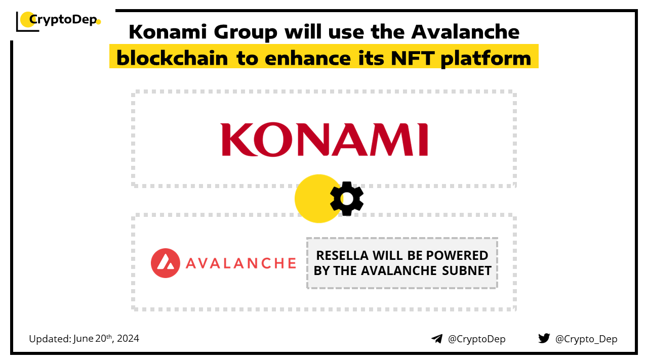 The digital arm of Konami Group, a Japanese entertainment and gaming giant, chooses Avalanche blockchain to enhance services for its Resella NFT platform. The platform will be powered by the Avalanche Subnet and supported by Ava Labsβ AvaCloud Web3 launchpad service.