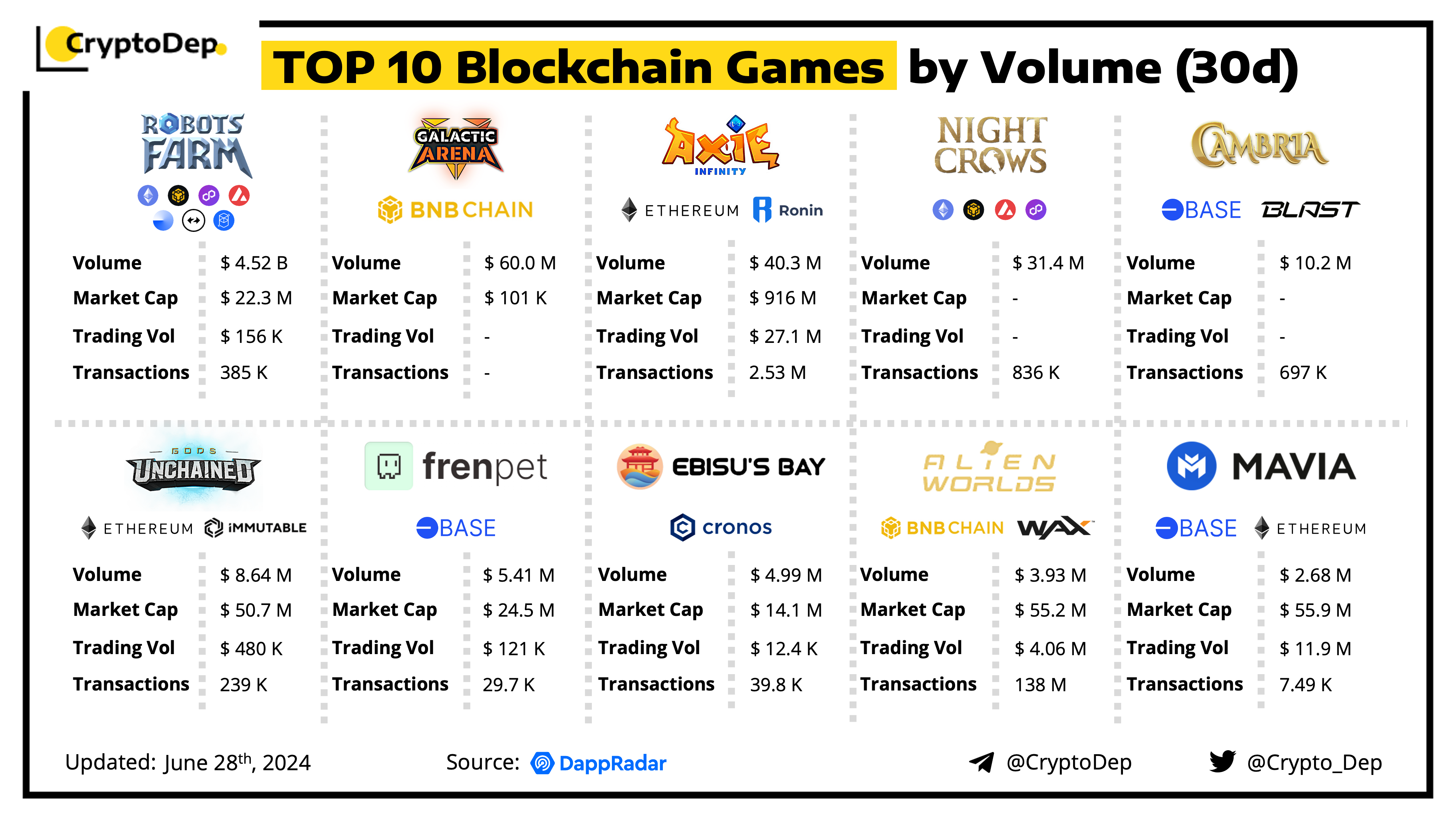 With the spread of Web3 technologies, blockchain games became the industry trend and keep on attracting the attention of gaming & crypto communities. We have made a recap of top blockchain games by volume in the last 30 days, so let's take a look!