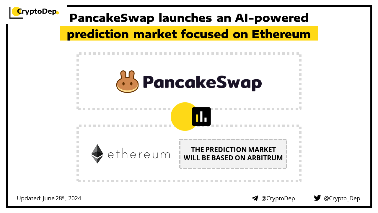 Decentralized exchange PancakeSwap is launching the Ethereum $ETH AI prediction market. The platform will be based on Arbitrum and rewards for correct predictions will be distributed from a 60K $ARB prize pool over the next 9 weeks. PancakeSwap has tapped decentralized AI network provider Allora to provide the AI predictions.