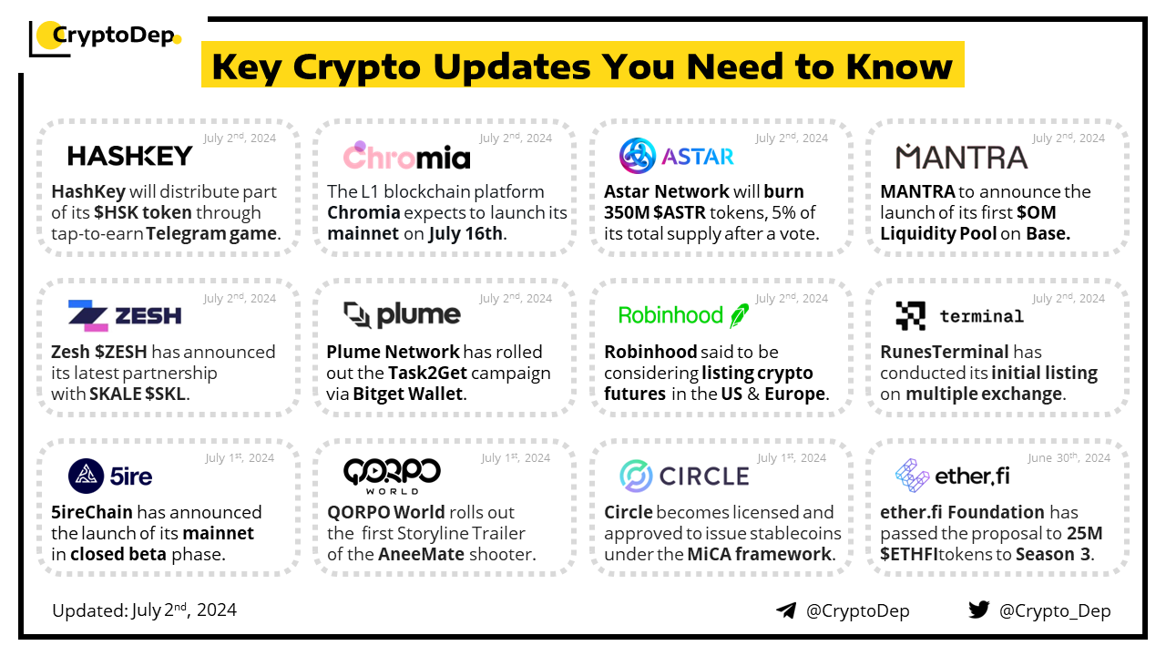Hashkey unveils an airdrop of 10M $HSK tokens ahead of its planned listing in Q3 2024. Users can now access the airdrop channel via the DejenDog Telegram bot and claim $HSK tokens by playing a tap-to-earn mini-game. The $HSK token has a total supply of 1B units, with 65% allocated for ecosystem growth. Back in April, HashKey Group introduced HashKey Chain, a zero knowledge-proof Layer 2 chain, with the testnet scheduled to go live within the next six months, and mainnet within a year.