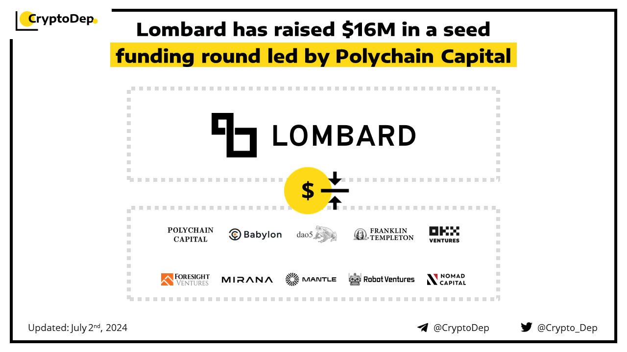 Lombard, a Bitcoin restaking platform, closes its $16M seed funding led by Polychain Capital. Among other participants are Babylon, dao5, Franklin Templeton, Foresight Ventures, Mirana Ventures, Mantle EcoFund, and Nomad Capital, among others. Lombard will use the financing to grow out the Bitcoin restaking ecosystem alongside Babylon, a Bitcoin staking protocol. Lombard will issue the liquid and yield-bearing representation of staked Bitcoin using the token LBTC to unlock liquidity.