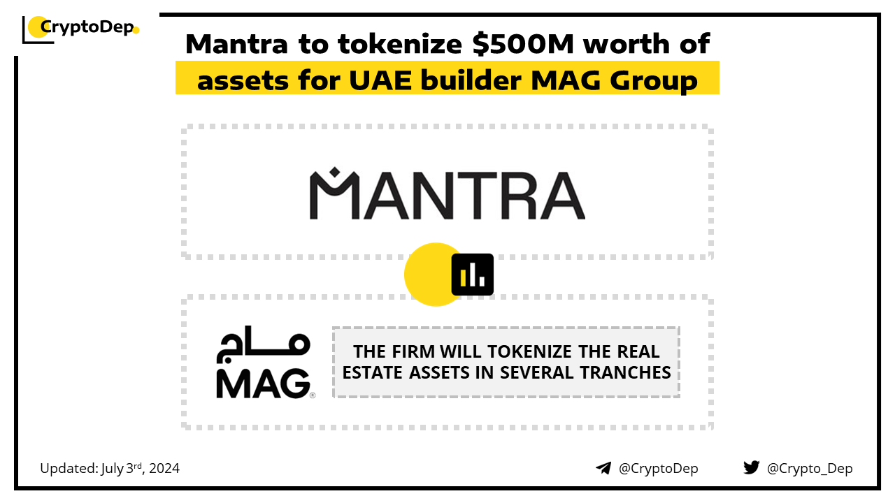 Mantra partners with Dubai-based real estate developer MAG Group to tokenize $500M real estate assets. The firm will tokenize the real estate assets in several tranches while the investors will earn yields through stablecoins and $OM tokens. Back in March, Mantra raised $11M from Shorooq Partners, Three Point Capital, Hex Trust, and others. MANTRA Chain is the RWA Layer 1 Blockchain, capable of adherence and enforcement of real-world regulatory requirements.
