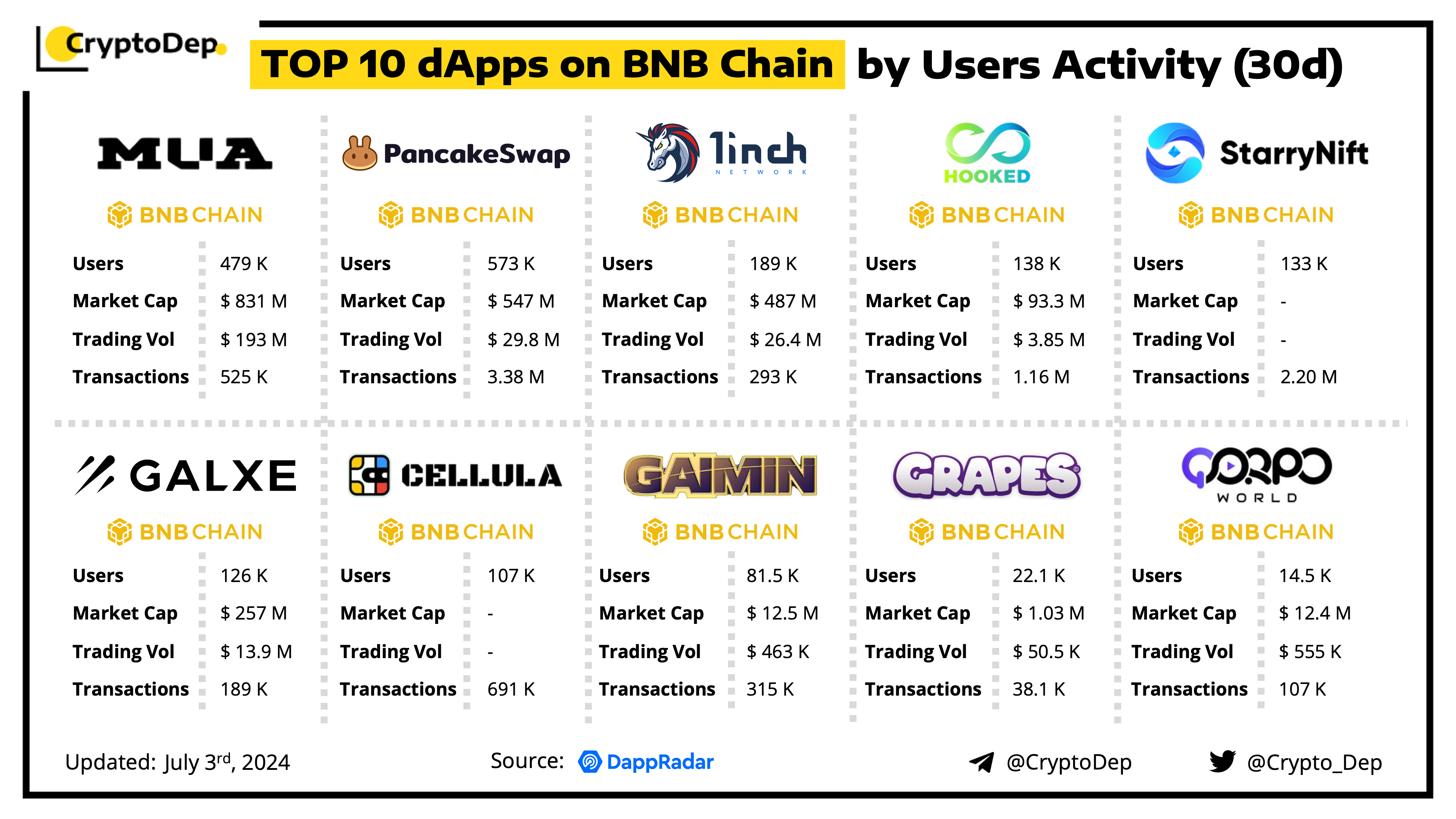 ββTOP 10 dApps on BNB Chain by Users Activity (30d)