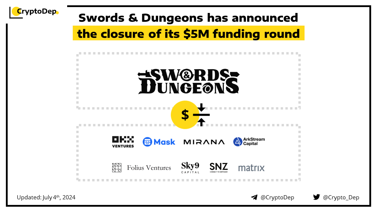 Swords & Dungeons, a P2E DeFi MMORPG, raises $5M in funding backed by OKX Ventures, Mask Network, Mirana, ArkStream Capital, Folius Ventures, Sky9 Capital, SNZ Holding, Matrix Partners, and others. The project will also wrap up its 2nd beta on July 19th and reward participants with 5M $GOLD.