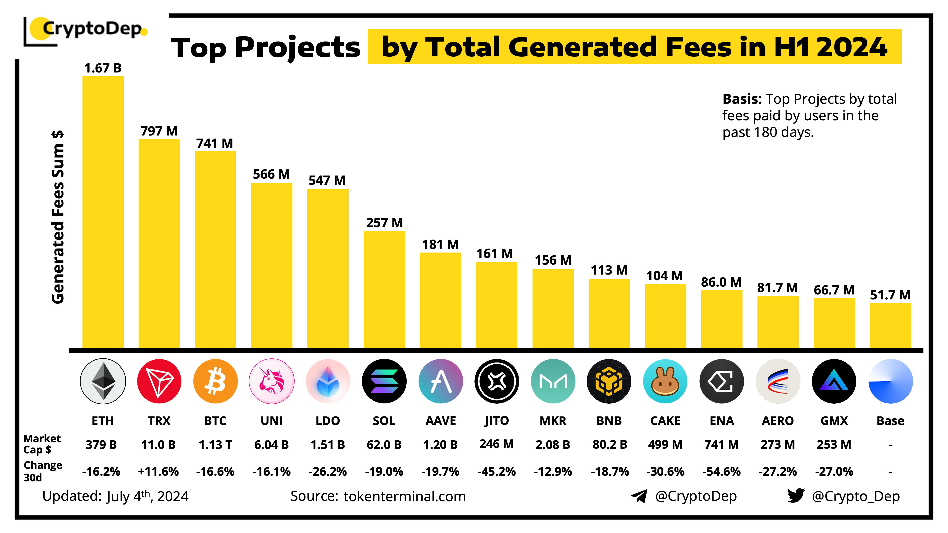 Let's take a look at the ranking of top blockchain protocols by total fees paid by users in the past 180 days, according to the data from Tokenterminal.