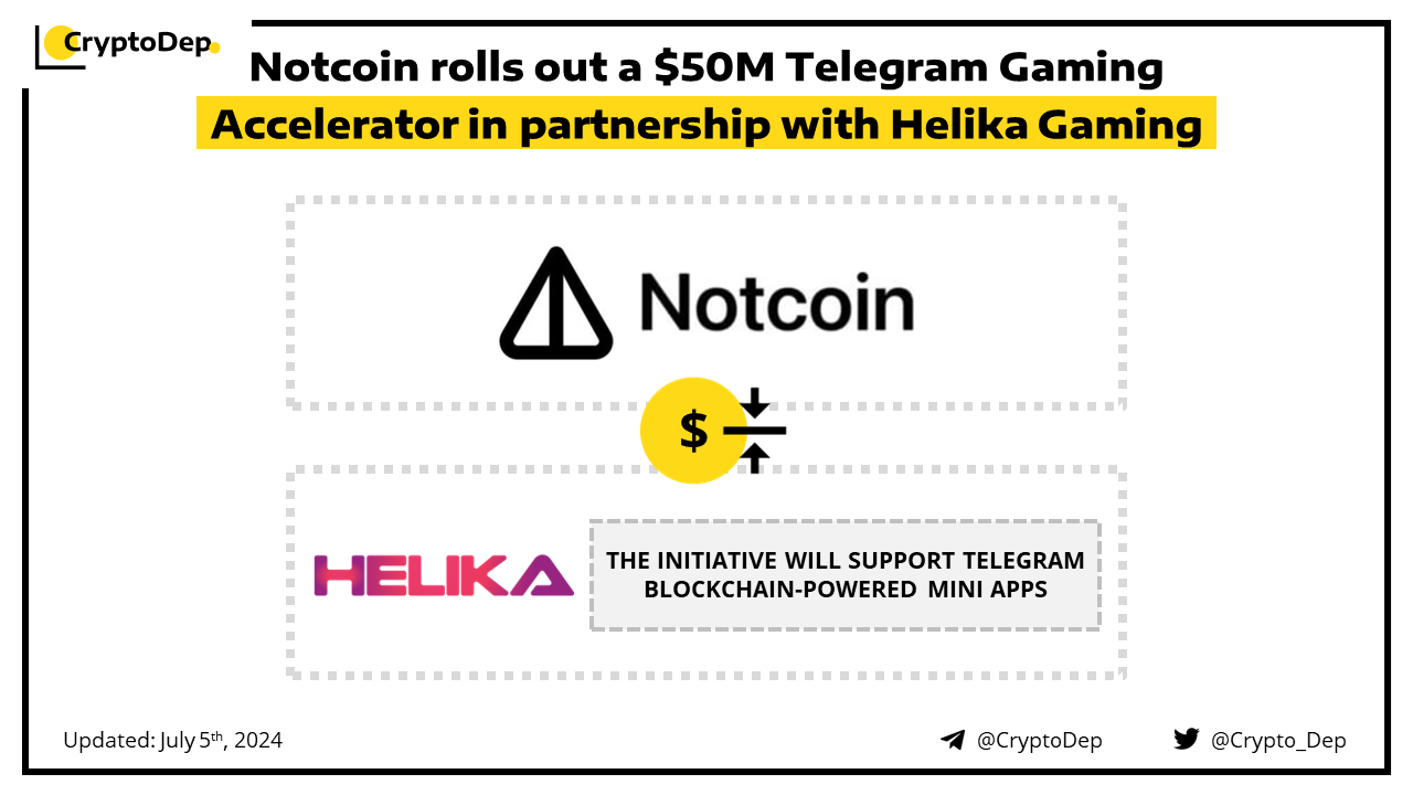 Notcoin has announced the launch of a $50M Telegram Gaming Accelerator in partnership with Helika Gaming. The initiative will accelerate the development of mini apps on top of the Telegram platform and TON blockchain. By teaming up with Helika Gaming, Notcoin plans to extend its accelerator program specifically for game developers. Notcoin is a TON-based community token that onboarded users into web3 through a tap-to-earn mining mechanic.