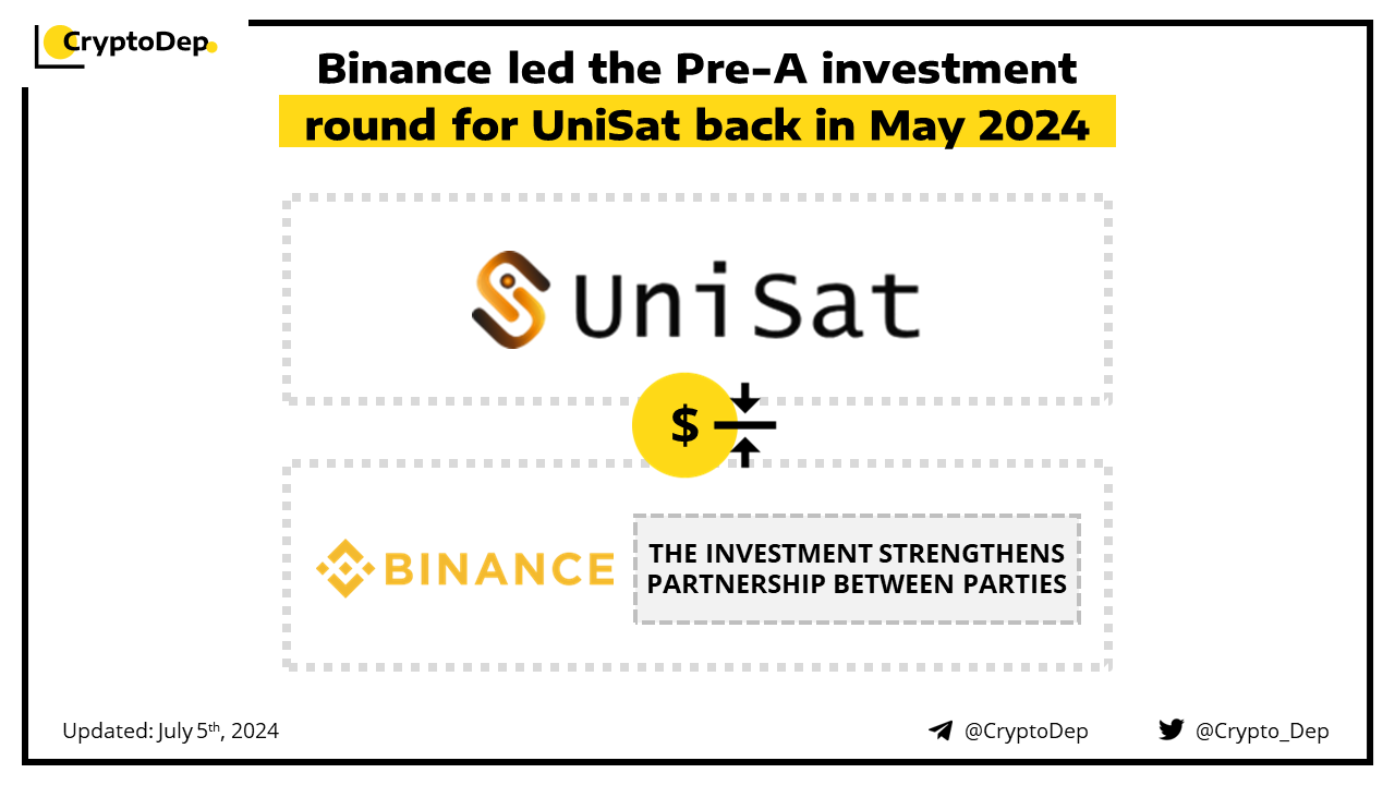 UniSat has disclosed that Binance led its Pre-A funding that was completed back in May 2024. This strategic investment strengthens the ongoing technical and business partnership between companies. Earlier in February, Binance launched its marketplace for inscription tokens using UniSat's API.