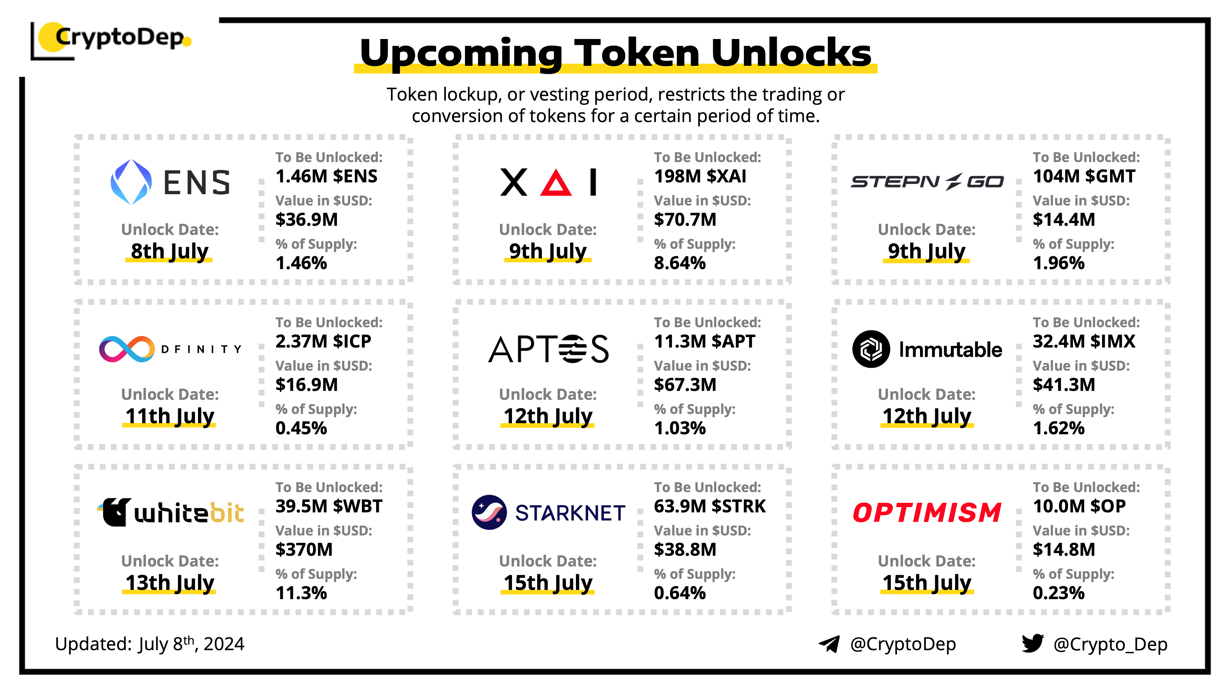 Let's take a look at the compilation of major upcoming token unlocks, diving into details such as dates, amounts, and projects related to tokens that are currently locked up, but will soon be released to the market. During this week, $WBT, $XAI, $APT, $IMX, and $STRK will have the biggest unlocks.