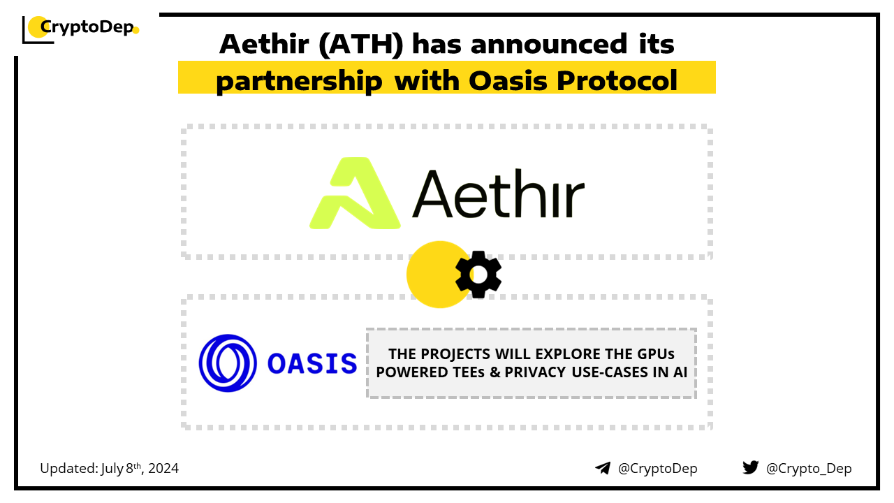 Aethir teams up with Oasis Protocol, a provider of a privacy layer for Web3 and AI. Through this partnership, the project will explore enhanced TEEs powered by GPUs, privacy use-cases in AI, and more. Aethir builds scalable decentralized cloud infrastructure for Gaming & AI, backed by HashKey Capital, Merit Circle, Big Brain Holdings, Momentum 6, and others.