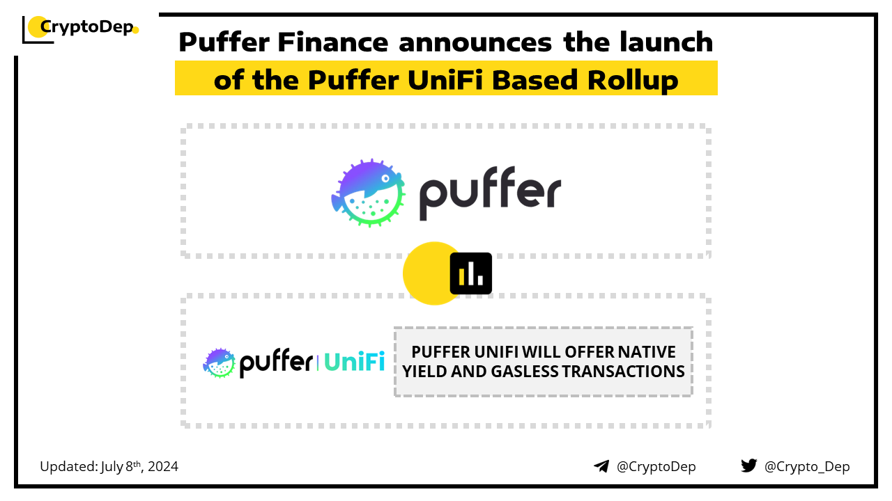 Puffer Finance rolls out Puffer UniFi, a Based Rollup designed to enhance the value flow back to Layer 1 and ensure credibly neutral transaction sequencing. Puffer UniFi will generate native yield through pufETH, Pufferβs Liquid Restaking Token and enable gasless transactions across based app-chains. Moreover, UniFi will empower dApps to launch their own based app-chains. Backed by Binance Labs, Coinbase Ventures, Consensys, and others, Puffer Finance is an Ethereum liquid restaking protocol with $1.52B in total value locked.