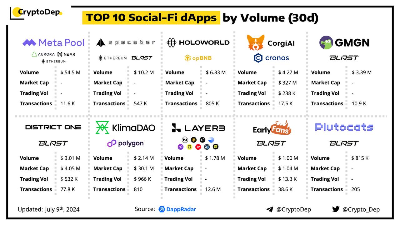 ββTOP 10 Social-Fi dApps by Volume (30d)