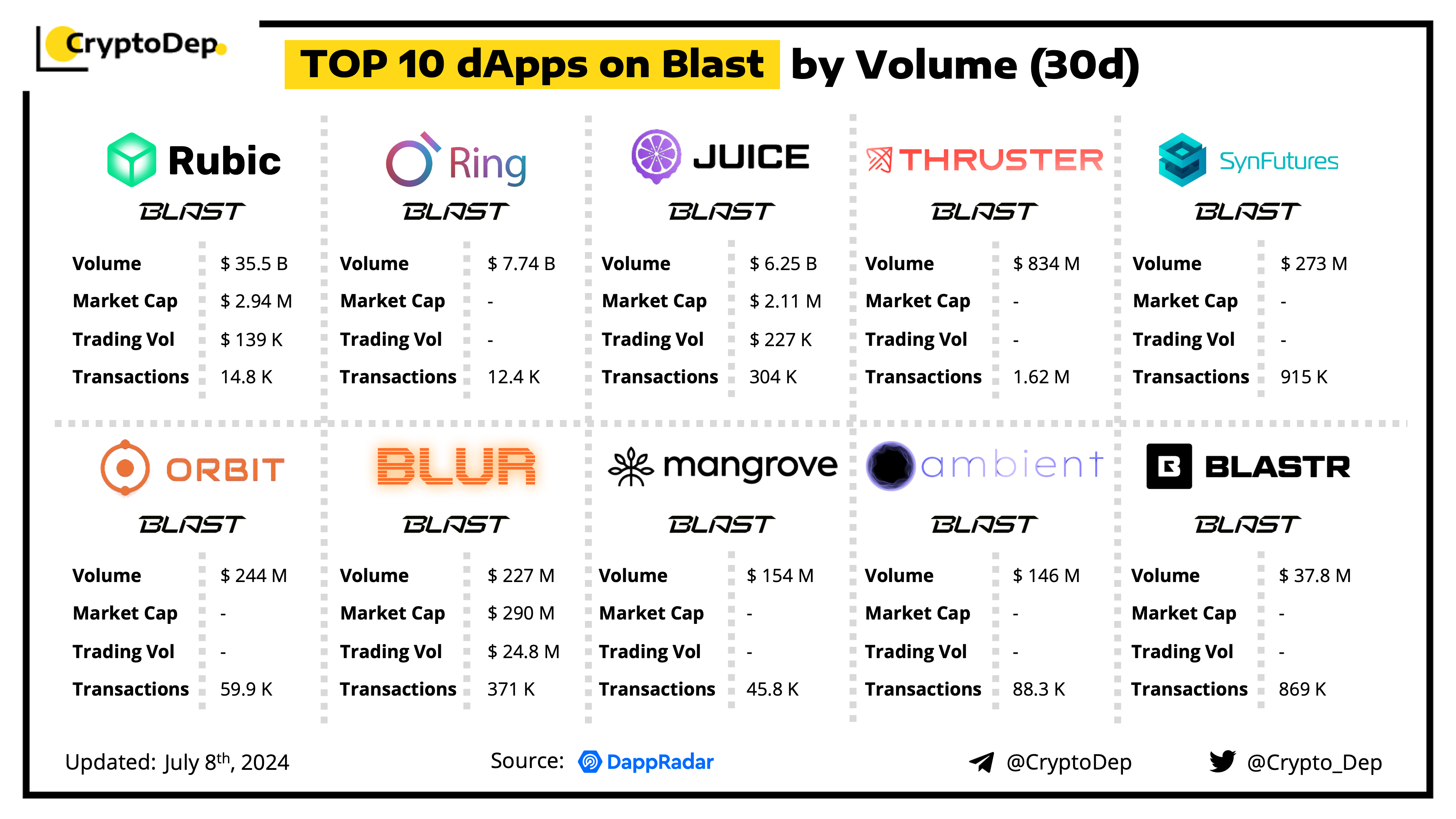 A decentralized application (dApp) is a program built on blockchain that combines a smart contract and a front-end user interface. We present the top dApps on #Blast by volume in the last 30 days, according to the data from DappRadar.