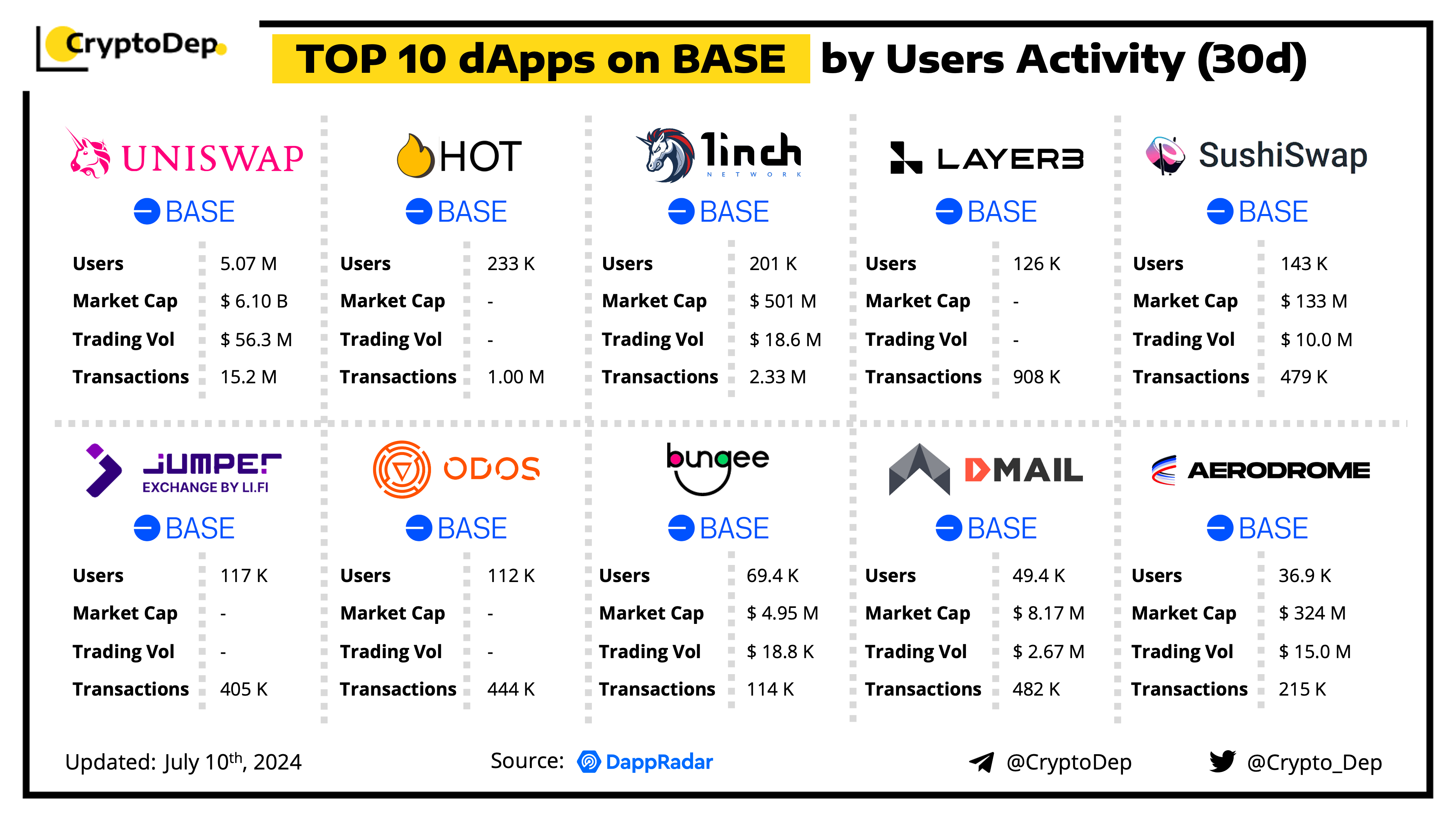 A decentralized application (dApp) is a program built on blockchain that combines a smart contract and a front-end user interface. We present the top dApps on #Base by users activity in the last 30 days, according to the data from DappRadar.
