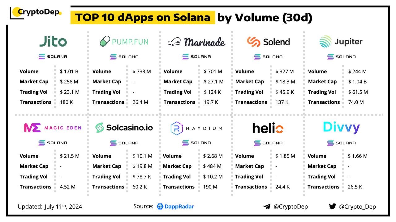 A decentralized application (dApp) is a program built on blockchain that combines a smart contract and a front-end user interface. We present the top dApps on #Solana by volume in the last 30 days, according to the data from DappRadar.