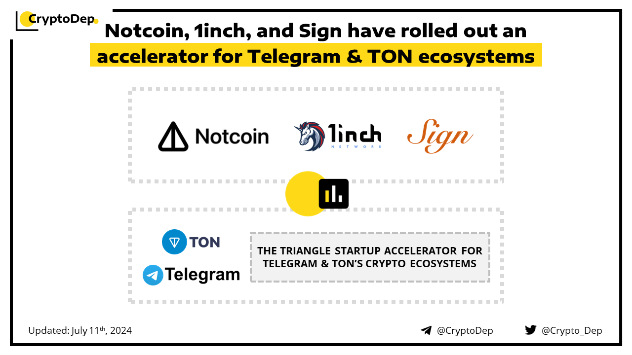 Notcoin, 1inch, and Sign join forces to introduce Triangle, a new startup accelerator for Telegram and TONβs crypto ecosystems. The initiative aims to improve TON UX, develop popular βtap-to-earnβ mini-apps, and launch applications bridging Web2 and Web3. Earlier this month, Notcoin and Helika Games launched a $50M Telegram Gaming Accelerator to bolster the development of mini apps on top of the Telegram platform and TON blockchain.