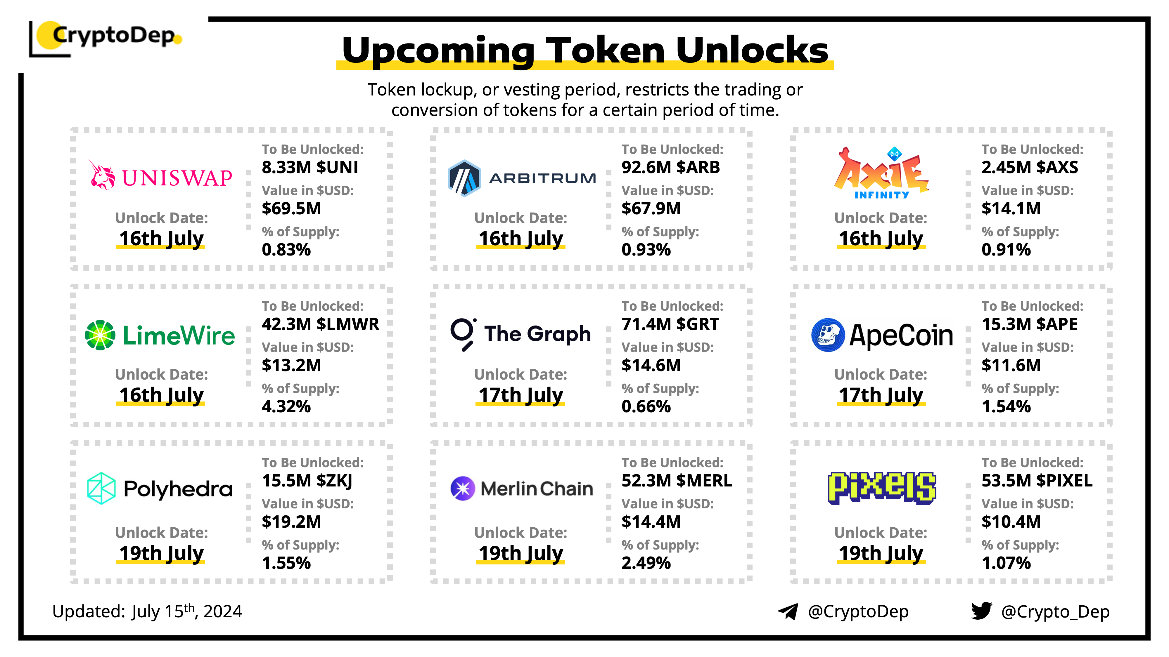 Let's take a look at the compilation of major upcoming token unlocks, diving into details such as dates, amounts, and projects related to tokens that are currently locked up, but will soon be released to the market. During this week, $UNI, $ARB, $ZKJ, $GRT, and $MERL will have the biggest unlocks.