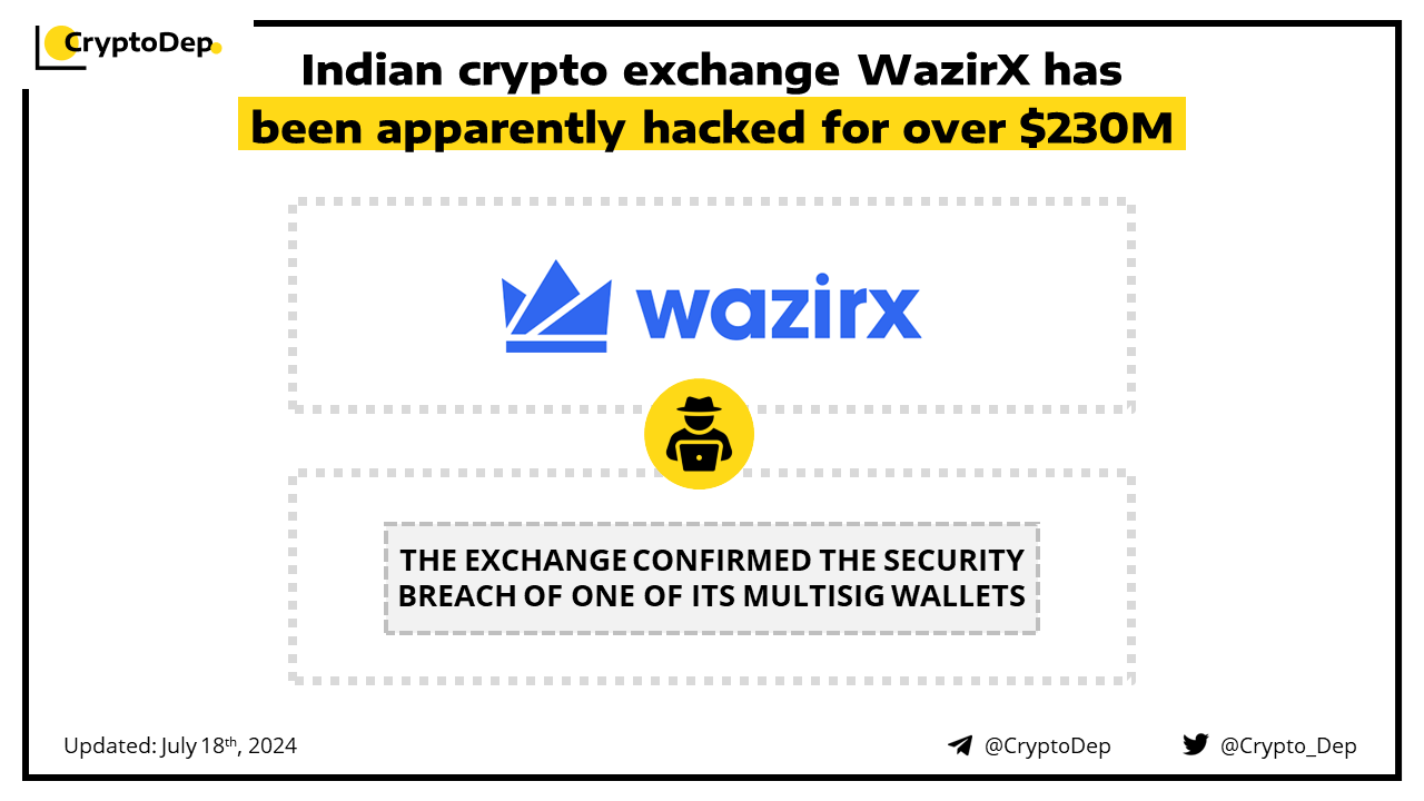 WazirX suffered a hot wallet exploit that resulted in the unauthorized transfer of ~$235M worth of crypto assets. The exchange confirmed the security breach of one of its multisig wallets. According to early blockchain data, over $100M worth of $SHIB tokens were withdrawn, followed by $52M in $ETH, $11M in $MATIC, and $6M in $PEPE.
