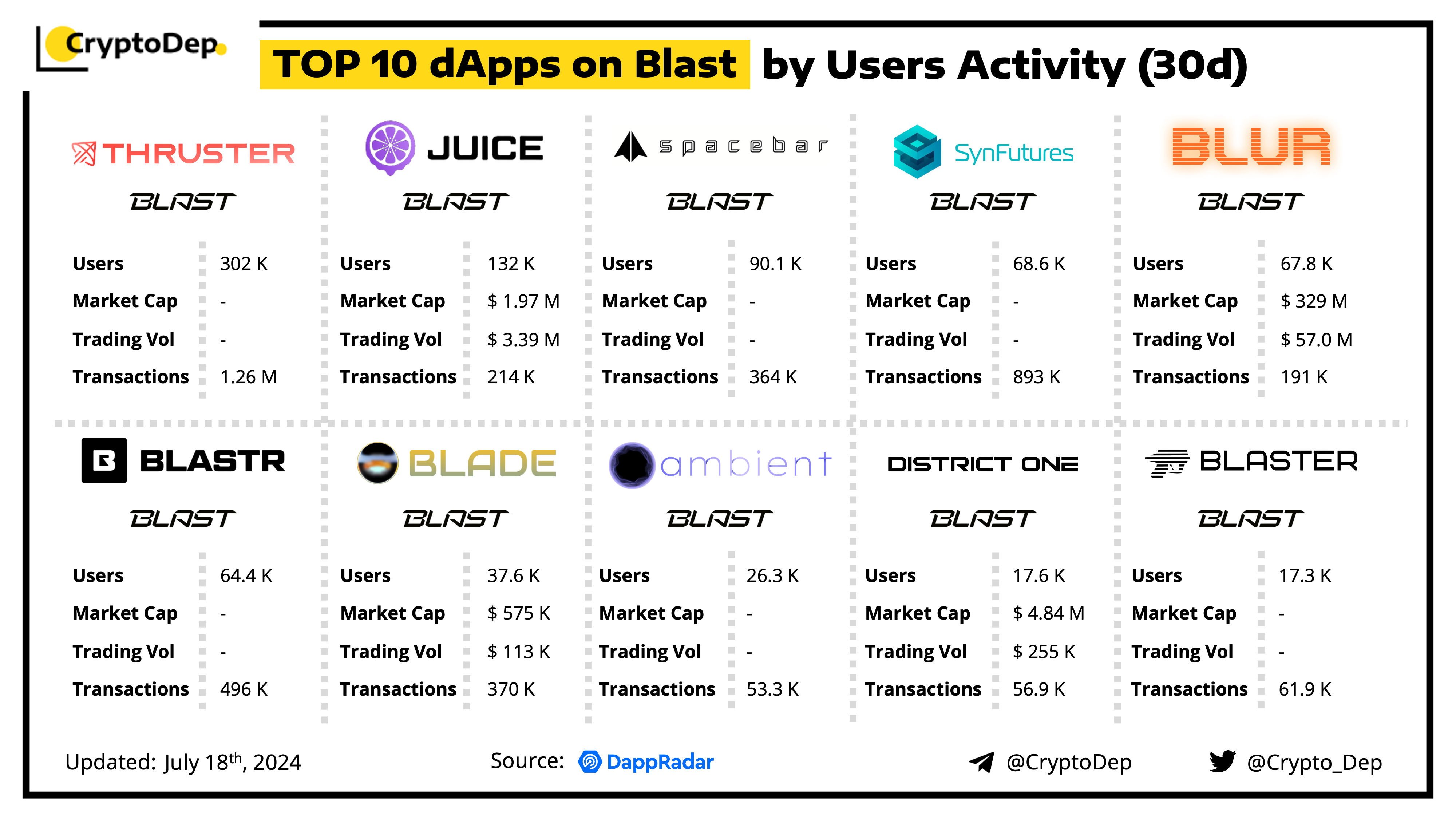 A decentralized application (dApp) is a program built on blockchain that combines a smart contract and a front-end user interface. We present the top dApps on #Blast by users activity in the last 30 days, according to the data from DappRadar.