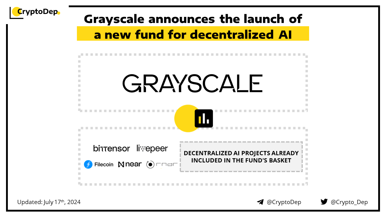 Grayscale rolls out a new fund focusing on decentralized artificial intelligence. The fund will finance three key areas, including AI services, problems related to centralized AI use, and AI-related infrastructure. Decentralized AI projects already included in the fund's basket as of today's launch are Bittensor, Filecoin, Livepeer, Near, and Render. Back in March 2024, Grayscale also established its cryptocurrency staking fund.