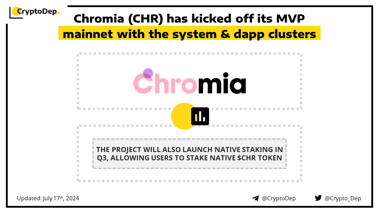 Chromia has successfully deployed its MVP mainnet across 16 system providers and 7 dapp providers, running one system cluster and one dapp cluster. The network is integrated into Chromia's core utilities, including the Chromia Vault wallet, and the Chromia Explorer block explorer. Moreover, Chromia disclosed its plans to launch its native staking in Q3, allowing users to stake native $CHR token. Chromia is a Layer-1 relational blockchain platform that uses a modular framework to empower users and developers with dedicated dapp chains, customizable fee structures, and enhanced digital assets.