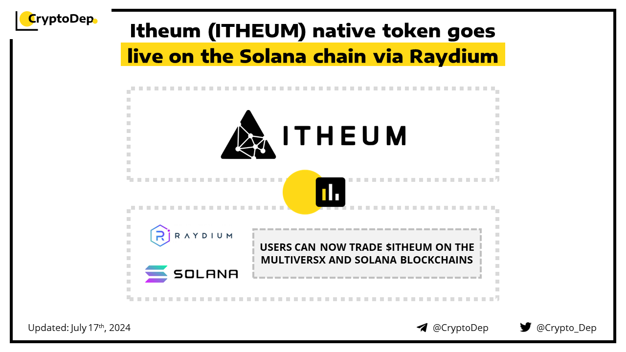 Itheum has deployed its $ITHEUM token on the Solana blockchain via Raydium Protocol. Through this integration, users can now trade $ITHEUM on both MultiversX and Solana blockchains. Earlier in June, Itheum rolled out its Data NFTs on Solana. Itheum is the decentralized data brokerage platform that transforms users' personal data into a highly tradable asset class.