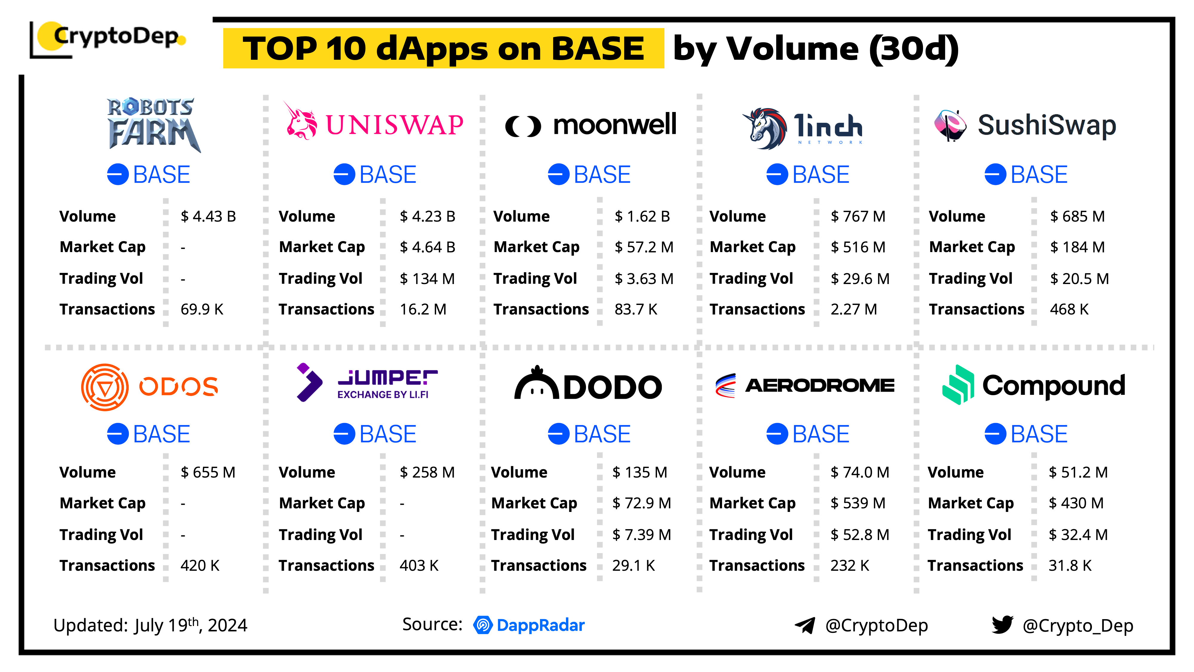 A decentralized application (dApp) is a program built on blockchain that combines a smart contract and a front-end user interface. We present the top dApps on #Base by volume in the last 30 days, according to the data from DappRadar.