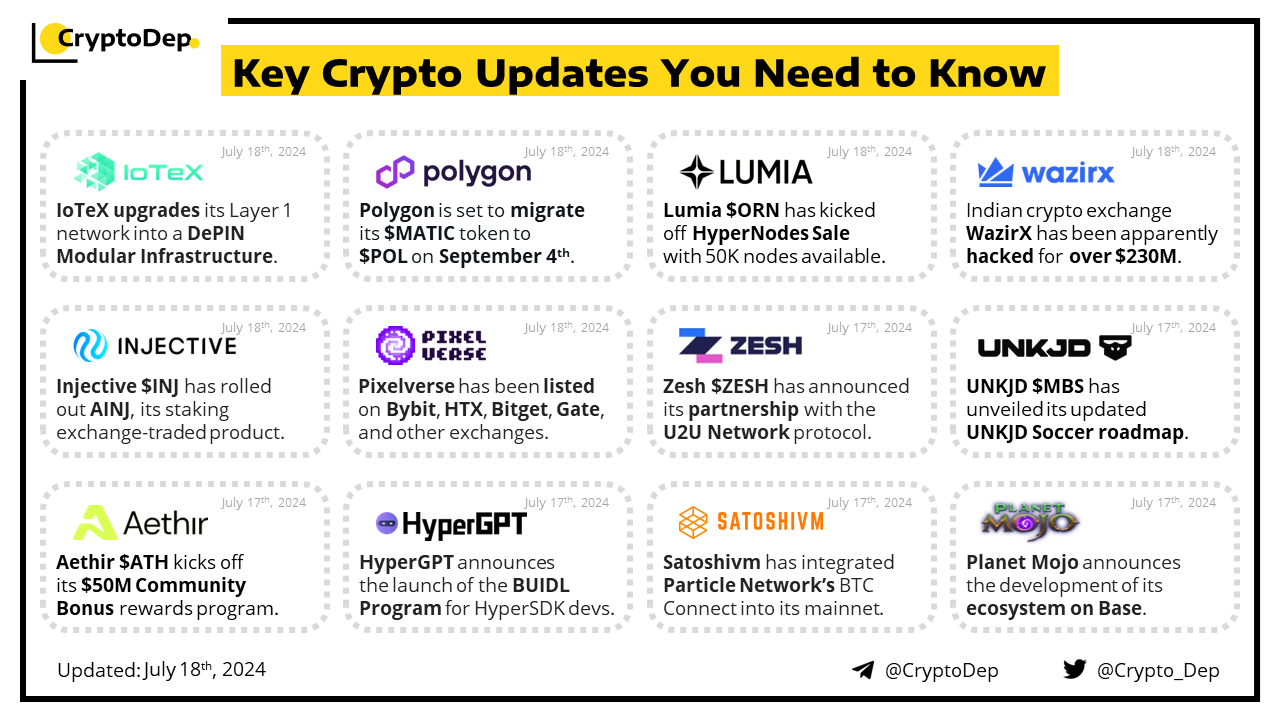 WazirX suffered a hot wallet exploit that resulted in the unauthorized transfer of ~$235M worth of crypto assets. The exchange confirmed the security breach of one of its multisig wallets. According to early blockchain data, over $100M worth of $SHIB tokens were withdrawn, followed by $52M in $ETH, $11M in $MATIC, and $6M in $PEPE.