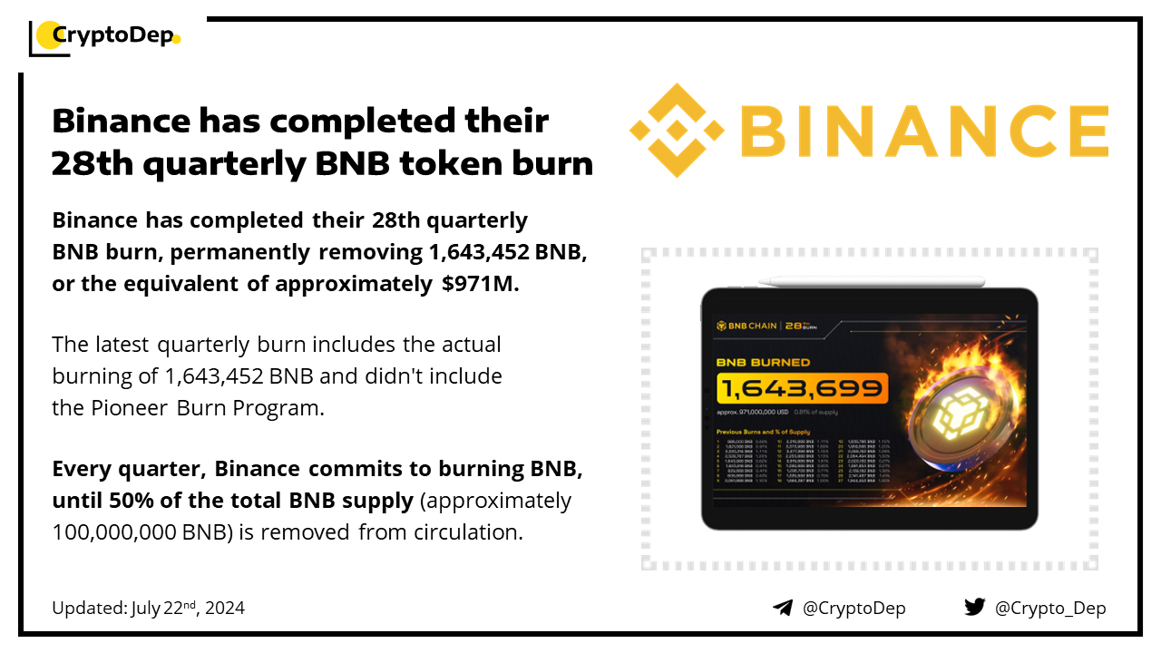 Binance has completed their 28th quarterly BNB burn, permanently removing 1,643,699 BNB, or the equivalent of approximately $971M. The latest quarterly burn includes the actual burning of 1,643,699 BNB, and didn't include the Pioneer Burn Program. Every quarter, Binance commits to burning BNB, until 50% of the total BNB supply (approximately 100,000,000 BNB) is removed from circulation.